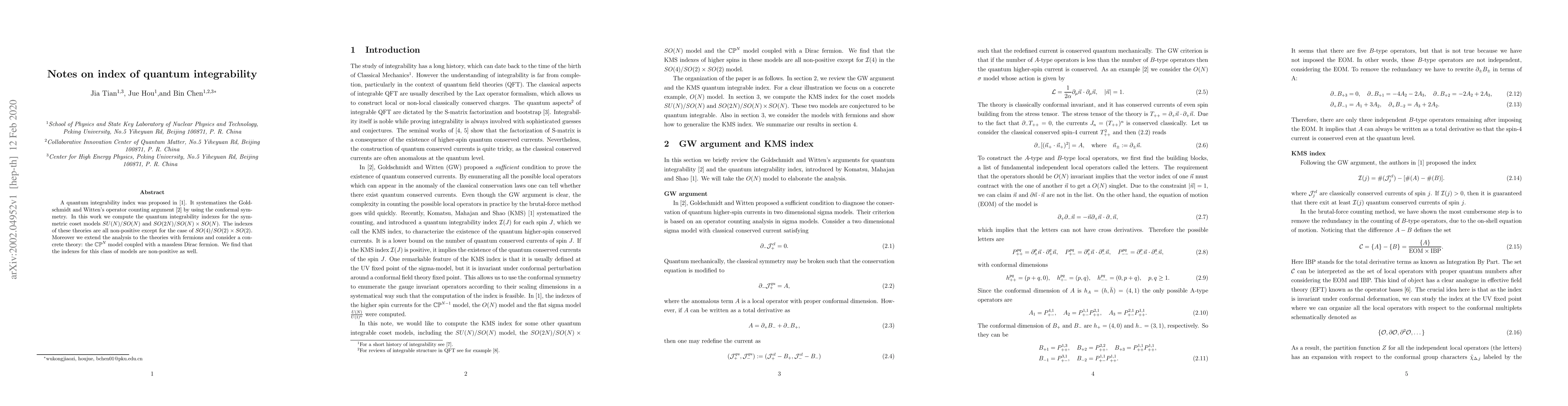 A quantum integrability index was proposed in \cite{KMS}. It systematizes the Goldschmidt and Witten's operator counting argument \cite{GW} by using the conformal symmetry. In this work we compute the quantum integrability indexes for the symmetric coset models ${SU(N)}/{SO(N)}$ and $SO(2N)/{SO(N)\times SO(N)}$. The indexes of these theories are all non-positive except for the case of ${SO(4)}/{SO(2)\times SO(2)}$. Moreover we extend the analysis to the theories with fermions and consider a concrete theory: the $\mathbb{CP}^N$ model coupled with a massless Dirac fermion. We find that the indexes for this class of models are non-positive as well.