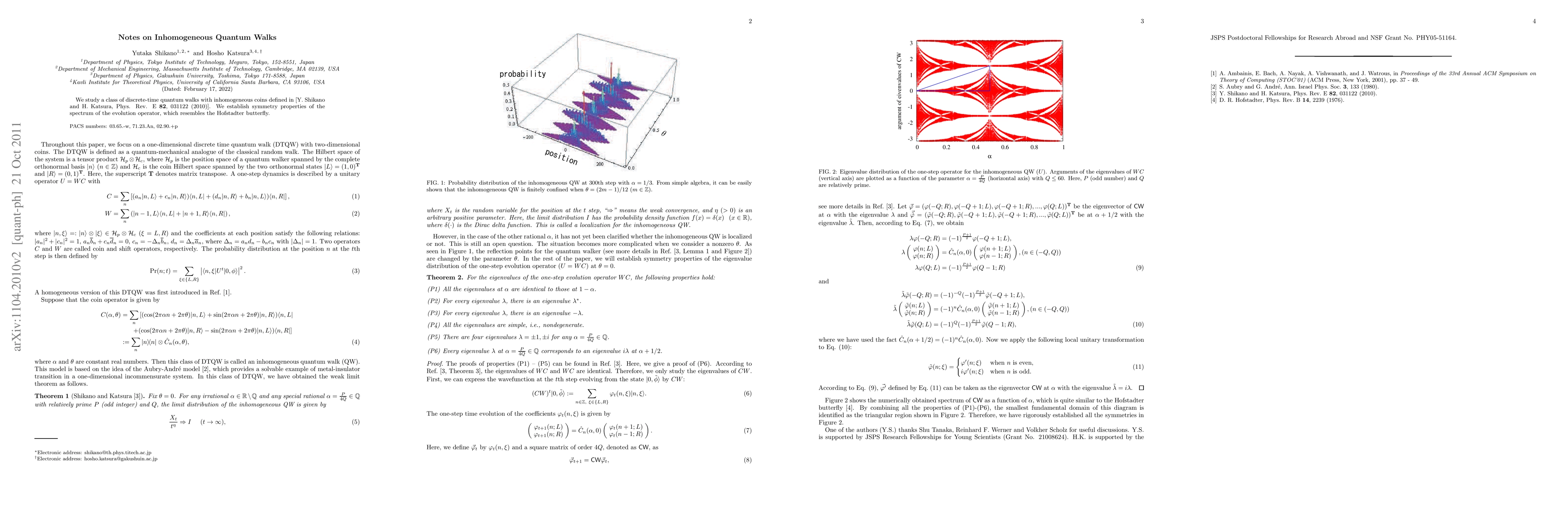 We study a class of discrete-time quantum walks with inhomogeneous coins defined in [Y. Shikano and H. Katsura, Phys. Rev. E {\bf 82}, 031122 (2010)]. We establish symmetry properties of the spectrum of the evolution operator, which resembles the Hofstadter butterfly.