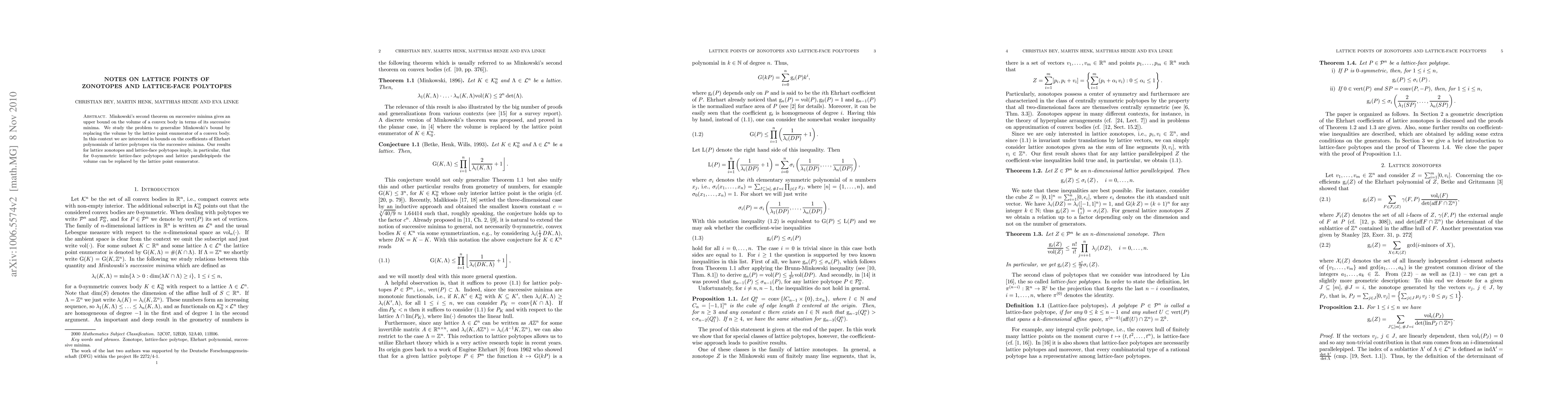 Minkowski's second theorem on successive minima gives an upper bound on the volume of a convex body in terms of its successive minima. We study the problem to generalize Minkowski's bound by replacing the volume by the lattice point enumerator of a convex body. In this context we are interested in bounds on the coefficients of Ehrhart polynomials of lattice polytopes via the successive minima. Our results for lattice zonotopes and lattice-face polytopes imply, in particular, that for 0-symmetric lattice-face polytopes and lattice parallelepipeds the volume can be replaced by the lattice point enumerator.