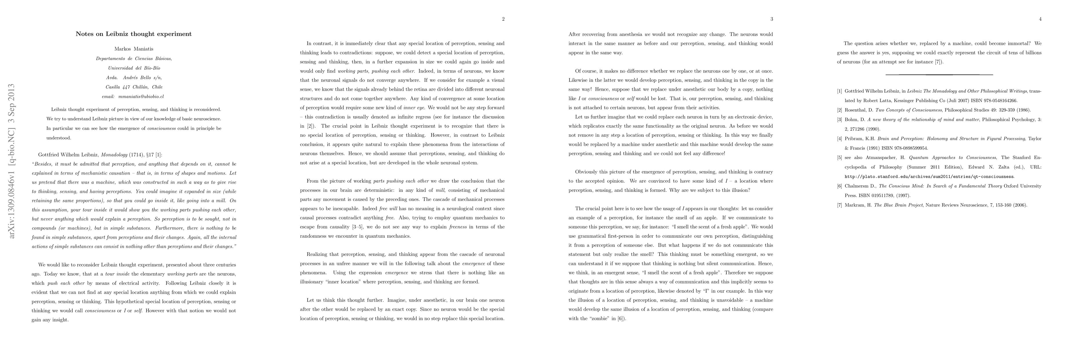 Leibniz thought experiment of perception, sensing, and thinking is reconsidered. We try to understand Leibniz picture in view of our knowledge of basic neuroscience. In particular we can see how the emergence of consciousness could in principle be understood.