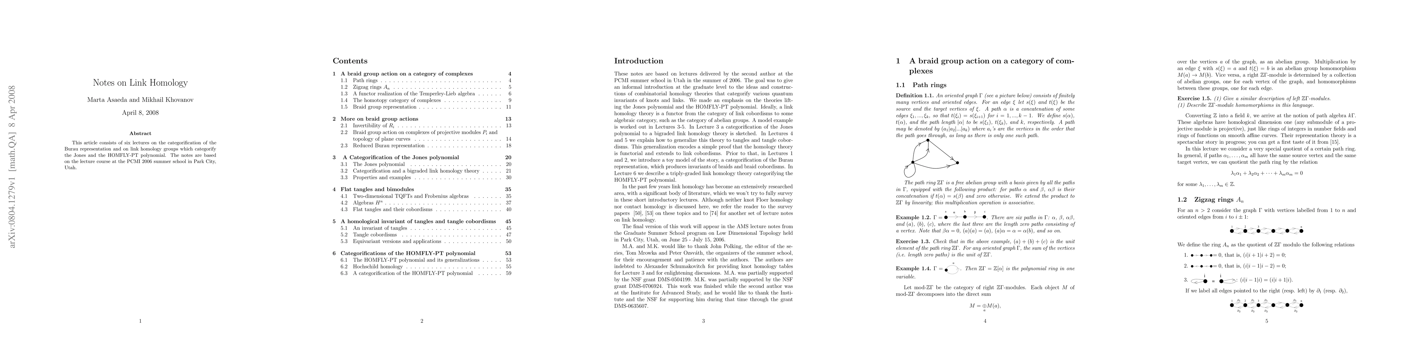 This paper presents six lectures on categorifying the Burau representation and introducing link homology groups, which provide a higher-dimensional perspective on the Jones and HOMFLY-PT polynomials. The material is based on a lecture series from the PCMI 2006 summer school in Park City, Utah.