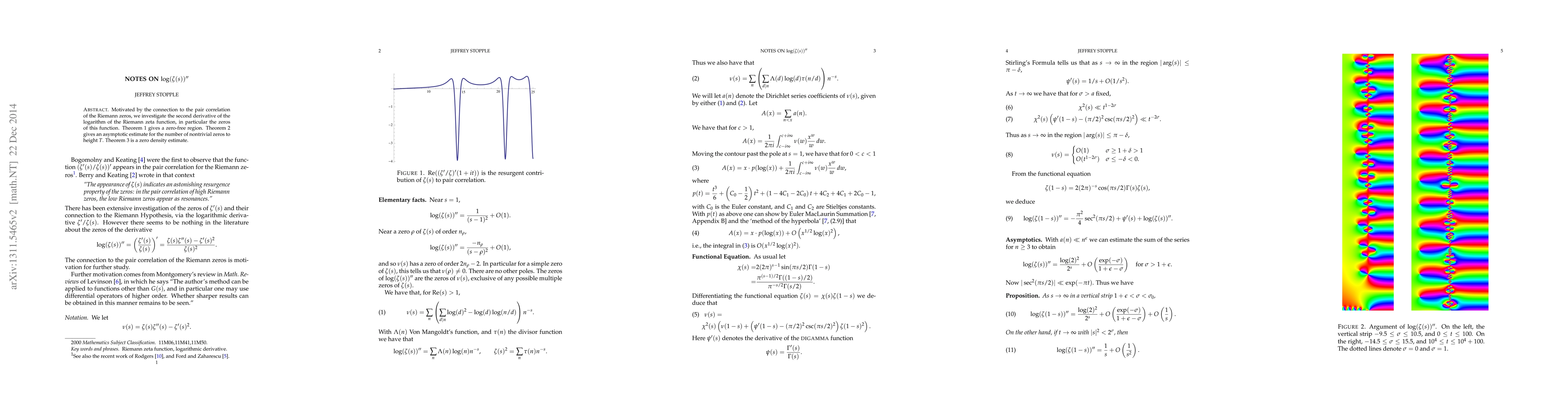 Motivated by the connection to the pair correlation of the Riemann zeros, we investigate the second derivative of the logarithm of the Riemann zeta function, in particular the zeros of this function. Theorem 1 gives a zero-free region. Theorem 2 gives an asymptotic estimate for the number of nontrivial zeros to height T. Theorem 3 is a zero density estimate.