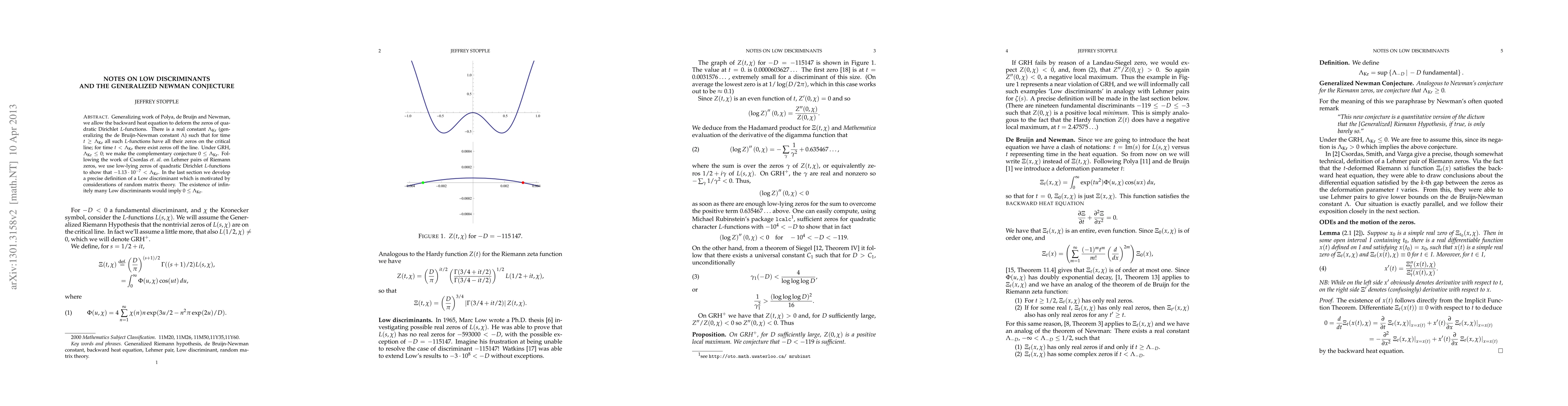 Generalizing work of Polya, de Bruijn and Newman, we allow the backward heat equation to deform the zeros of quadratic Dirichlet L-functions. There is a real constant \Lambda_Kr (generalizing the de Bruijn-Newman constant \Lambda) such that for time t>=\Lambda_Kr all such L-functions have all their zeros on the critical line; for time t<\Lambda_Kr there exist zeros off the line. Under GRH, \Lambda_Kr<=0; we make the complementary conjecture 0<=\Lambda_Kr. Following the work of Csordas et. al. on Lehmer pairs of Riemann zeros, we use low-lying zeros of quadratic Dirichlet L-functions to show that -1.13* 10^{-7}<\Lambda_Kr. In the last section we develop a precise definition of a Low discriminant which is motivated by considerations of random matrix theory. The existence of infinitely many Low discriminants would imply 0<=\Lambda_Kr.
