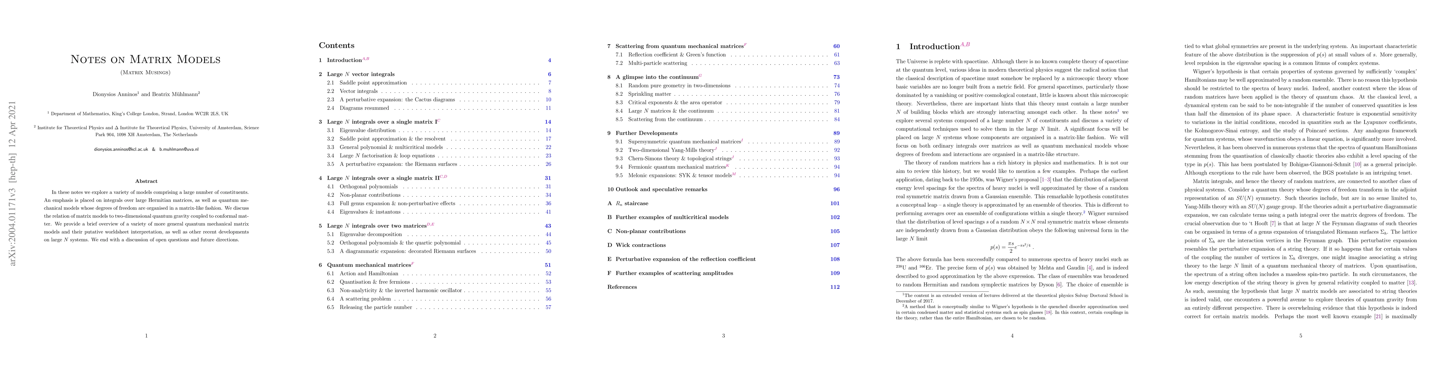 In these notes we explore a variety of models comprising a large number of constituents. An emphasis is placed on integrals over large Hermitian matrices, as well as quantum mechanical models whose degrees of freedom are organised in a matrix-like fashion. We discuss the relation of matrix models to two-dimensional quantum gravity coupled to conformal matter. We provide a brief overview of a variety of more general quantum mechanical matrix models and their putative worldsheet interpretation, as well as other recent developments on large $N$ systems. We end with a discussion of open questions and future directions.