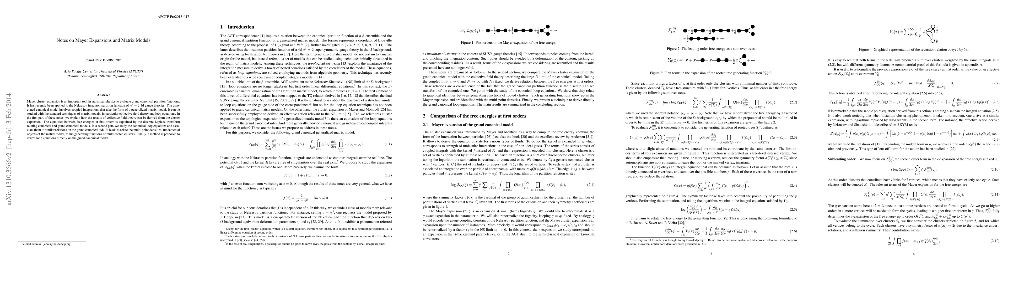 Mayer cluster expansion is an important tool in statistical physics to evaluate grand canonical partition functions. It has recently been applied to the Nekrasov instanton partition function of $\mathcal{N}=2$ 4d gauge theories. The associated canonical model involves coupled integrations that take the form of a generalized matrix model. It can be studied with the standard techniques of matrix models, in particular collective field theory and loop equations. In the first part of these notes, we explain how the results of collective field theory can be derived from the cluster expansion. The equalities between free energies at first orders is explained by the discrete Laplace transform relating canonical and grand canonical models. In a second part, we study the canonical loop equations and associate them to similar relations on the grand canonical side. It leads to relate the multi-point densities, fundamental objects of the matrix model, to the generating functions of multi-rooted clusters. Finally, a method is proposed to derive loop equations directly on the grand canonical model.