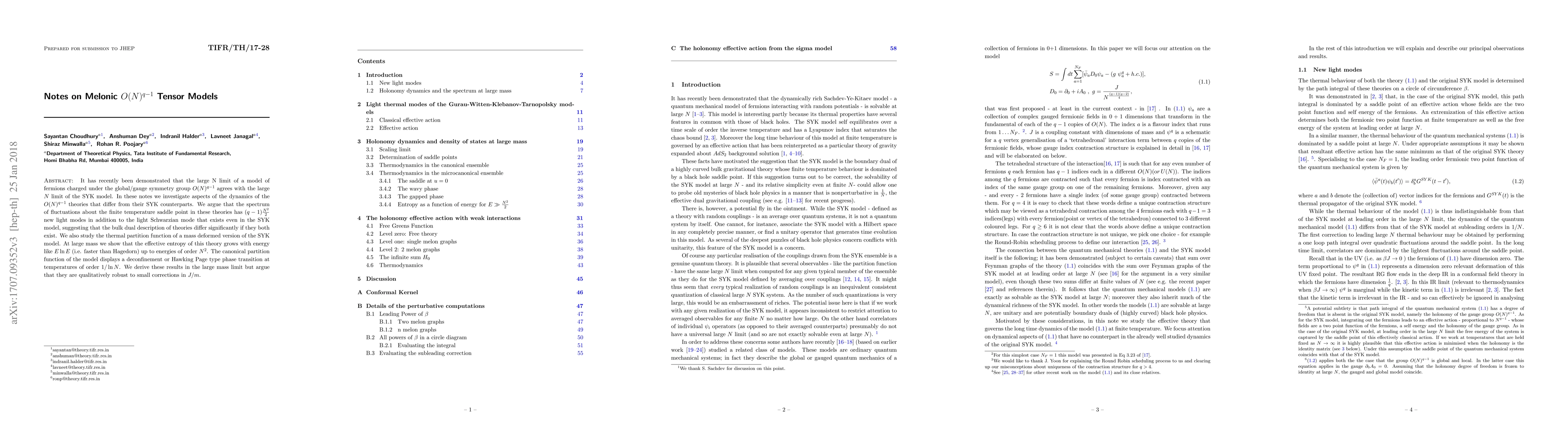 It has recently been demonstrated that the large N limit of a model of fermions charged under the global/gauge symmetry group $O(N)^{q-1}$ agrees with the large $N$ limit of the SYK model. In these notes we investigate aspects of the dynamics of the $O(N)^{q-1}$ theories that differ from their SYK counterparts. We argue that the spectrum of fluctuations about the finite temperature saddle point in these theories has $(q-1)\frac{N^2}{2}$ new light modes in addition to the light Schwarzian mode that exists even in the SYK model, suggesting that the bulk dual description of theories differ significantly if they both exist. We also study the thermal partition function of a mass deformed version of the SYK model. At large mass we show that the effective entropy of this theory grows with energy like $E \ln E$ (i.e. faster than Hagedorn) up to energies of order $N^2$. The canonical partition function of the model displays a deconfinement or Hawking Page type phase transition at temperatures of order $1/\ln N$. We derive these results in the large mass limit but argue that they are qualitatively robust to small corrections in $J/m$.