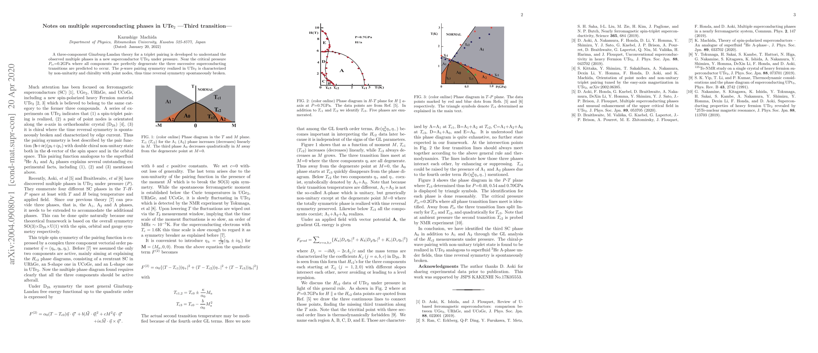 This paper develops a three-component Ginzburg-Landau theory for triplet pairing to explain multiple superconducting phases in UTe$_2$ under pressure. It predicts three successive transitions near $P_{\rm cr}$=0.2GPa, characterized by $p$-wave pairing with non-unitarity, chirality, and point nodes, indicating spontaneous breaking of time reversal symmetry.