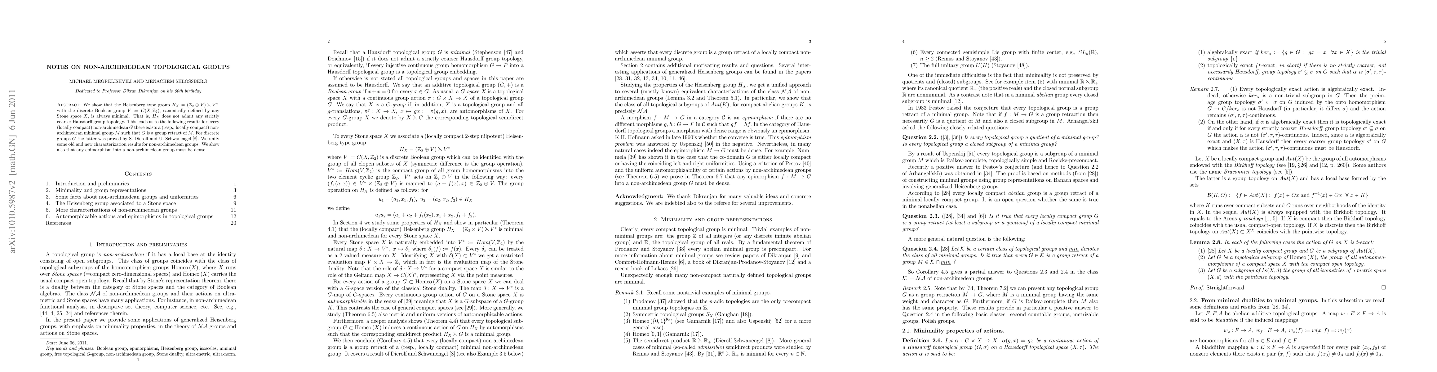 We show that the Heisenberg type group $H_X=(\Bbb{Z}_2 \oplus V) \leftthreetimes V^{\ast}$, with the discrete Boolean group $V:=C(X,\Z_2)$, canonically defined by any Stone space $X$, is always minimal. That is, $H_X$ does not admit any strictly coarser Hausdorff group topology. This leads us to the following result: for every (locally compact) non-archimedean $G$ there exists a (resp., locally compact) non-archimedean minimal group $M$ such that $G$ is a group retract of $M.$ For discrete groups $G$ the latter was proved by S. Dierolf and U. Schwanengel. We unify some old and new characterization results for non-archimedean groups. Among others we show that every continuous group action of $G$ on a Stone space $X$ is a restriction of a continuous group action by automorphisms of $G$ on a topological (even, compact) group $K$. We show also that any epimorphism $f: H \to G$ (in the category of Hausdorff topological groups) into a non-archimedean group $G$ must be dense.