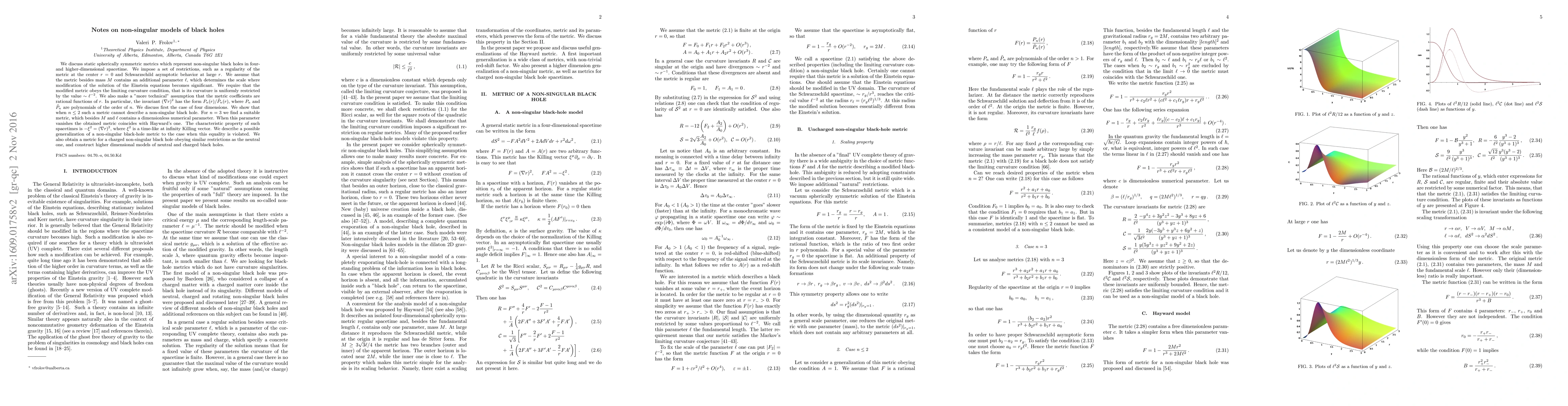 We discuss static spherically symmetric metrics which represent non-singular black holes in four- and higher-dimensional spacetime. We impose a set of restrictions, such as a regularity of the metric at the center $r=0$ and Schwarzschild asymptotic behavior at large $r$. We assume that the metric besides mass $M$ contains an additional parameter $\ell$, which determines the scale where modification of the solution of the Einstein equations becomes significant. We require that the modified metric obeys the limiting curvature condition, that is its curvature is uniformly restricted by the value $\sim \ell^{-2}$. We also make a "more technical" assumption that the metric coefficients are rational functions of $r$. In particular, the invariant $(\nabla r)^2$ has the form $P_n(r)/\tilde{P}_n(r)$, where $P_n$ and $\tilde{P}_n$ are polynomials of the order of $n$. We discuss first the case of four dimensions. We show that when $n\le 2$ such a metric cannot describe a non-singular black hole. For $n=3$ we find a suitable metric, which besides $M$ and $\ell$ contains a dimensionless numerical parameter. When this parameter vanishes the obtained metric coincides with Hayward's one. The characteristic property of such spacetimes is $-\xi^2=(\nabla r)^2$, where $\xi^2$ is a time-like at infinity Killing vector. We describe a possible generalization of a non-singular black-hole metric to the case when this equality is violated. We also obtain a metric for a charged non-singular black hole obeying similar restrictions as the neutral one, and construct higher dimensional models of neutral and charged black holes.
