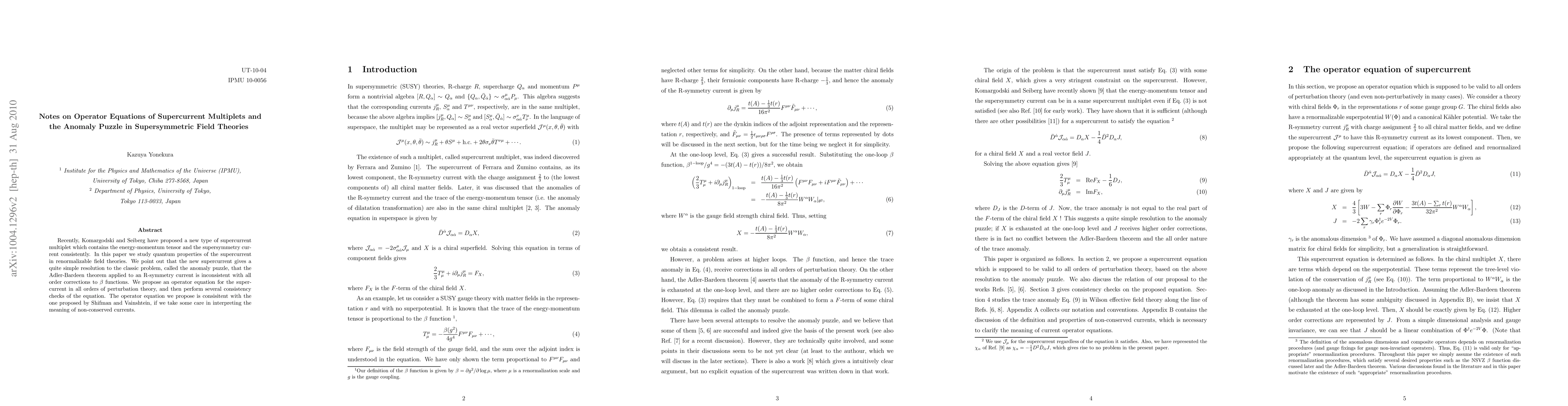 Researchers propose a new operator equation for supercurrents in supersymmetric field theories, resolving the anomaly puzzle and providing consistency checks with existing theories.