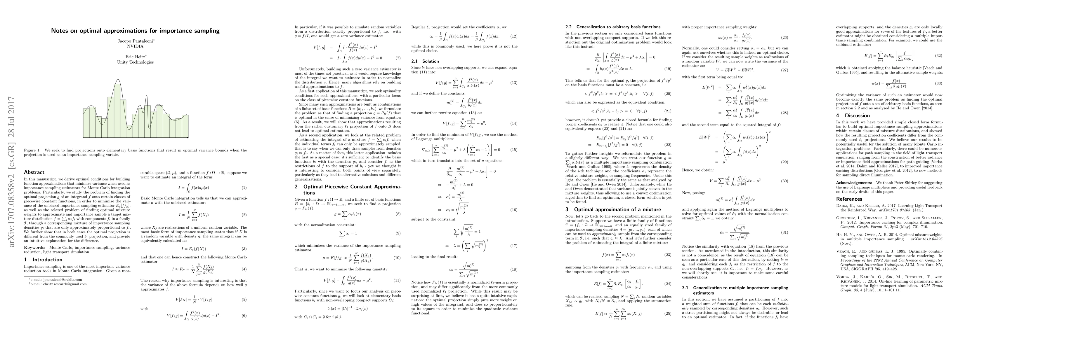 In this manuscript, we derive optimal conditions for building function approximations that minimize variance when used as importance sampling estimators for Monte Carlo integration problems. Particularly, we study the problem of finding the optimal projection $g$ of an integrand $f$ onto certain classes of piecewise constant functions, in order to minimize the variance of the unbiased importance sampling estimator $E_g[f/g]$, as well as the related problem of finding optimal mixture weights to approximate and importance sample a target mixture distribution $f = \sum_i \alpha_i f_i$ with components $f_i$ in a family $\mathcal{F}$, through a corresponding mixture of importance sampling densities $g_i$ that are only approximately proportional to $f_i$. We further show that in both cases the optimal projection is different from the commonly used $\ell_1$ projection, and provide an intuitive explanation for the difference.
