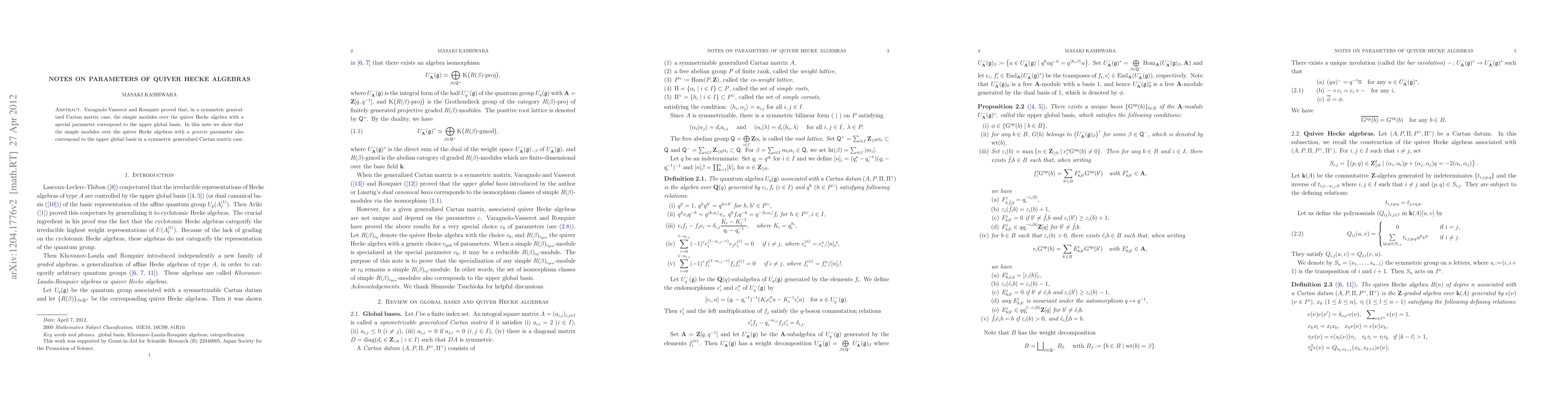 The paper builds on previous work by Varagnolo-Vasserot and Rouquier, focusing on quiver Hecke algebras and their simple modules. It explores the correspondence of simple modules with the upper global basis for both special and generic parameters in a symmetric generalized Cartan matrix case.