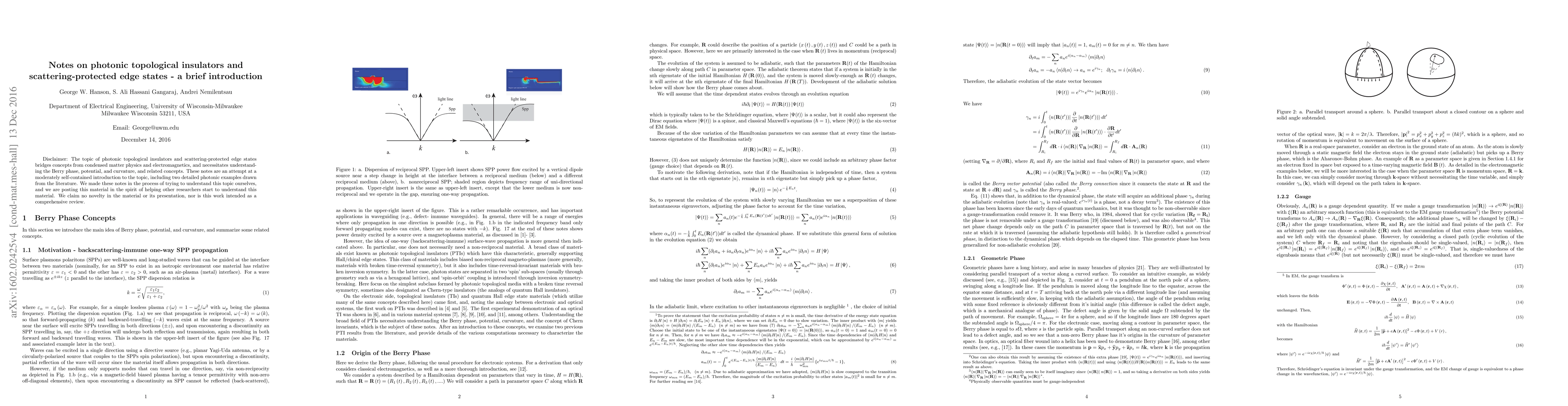 The topic of photonic topological insulators and scattering-protected edge states bridges concepts from condensed matter physics and electromagnetics, and necessitates understanding the Berry potential and related concepts. These notes are an attempt at a moderately self-contained introduction to the topic, including two detailed photonic examples drawn from the literature. We made these notes in the process of trying to understand this topic ourselves, and we are posting this material in the spirit of helping other researchers start to understand this material. We claim no novelty in the material or its presentation.