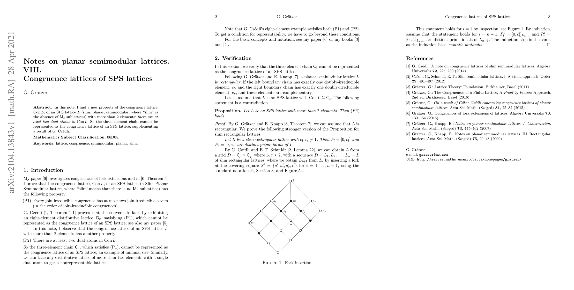 Researchers found that congruence lattices of SPS lattices with more than 2 elements always have at least two dual atoms, contradicting a previous result.