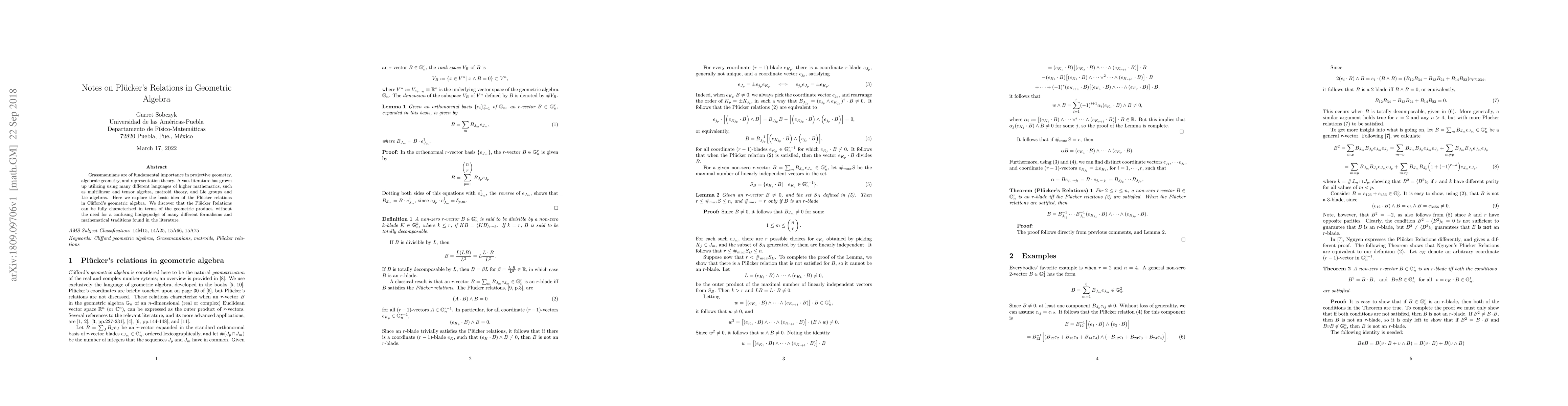 Grassmannians are of fundamental importance in projective geometry, algebraic geometry, and representation theory. A vast literature has grown up utilizing using many different languages of higher mathematics, such as multilinear and tensor algebra, matroid theory, and Lie groups and Lie algebras. Here we explore the basic idea of the Plucker relations in Clifford's geometric algebra. We discover that the Plucker Relations can be fully characterized in terms of the geometric product, without the need for a confusing hodgepodge of many different formalisms and mathematical traditions found in the literature.