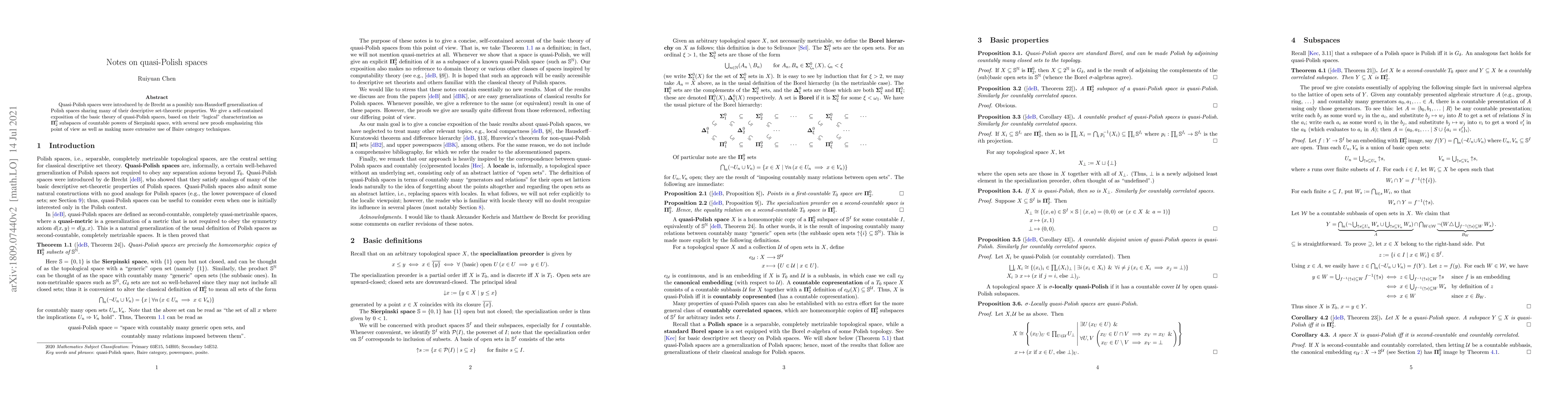 Summary: The paper introduces quasi-Polish spaces, a non-Hausdorff generalization of Polish spaces, and presents their basic theory through a logical characterization as $\mathbf{\Pi}^0_2$ subspaces of countable powers of Sierpinski space, with new proofs leveraging Baire category techniques.