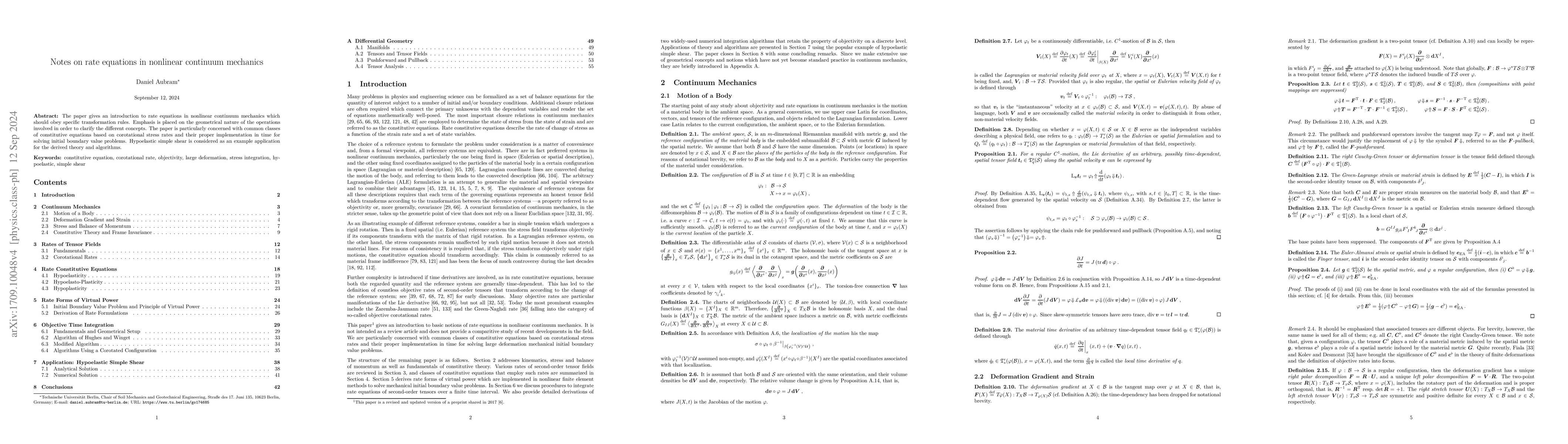 This paper introduces rate equations in nonlinear continuum mechanics, focusing on geometrical transformations and proper implementation for solving initial boundary value problems. It provides a theoretical framework for common classes of constitutive equations, including hypoelastic simple shear.