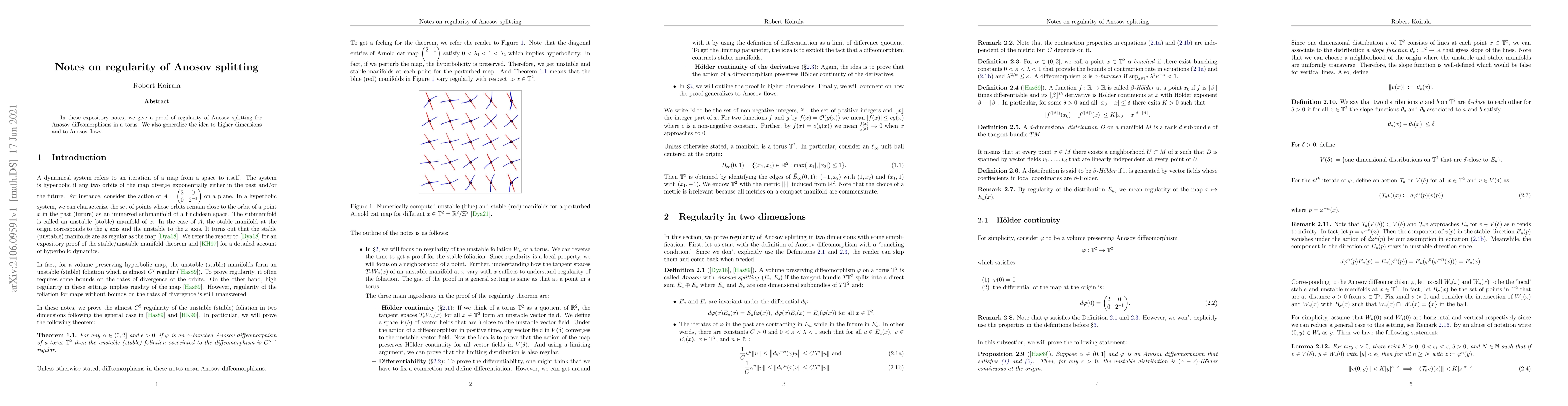 This paper proves the regularity of Anosov splitting for Anosov diffeomorphisms in a torus and extends this idea to higher dimensions and Anosov flows. The work provides a comprehensive understanding of the structural properties of Anosov dynamics.