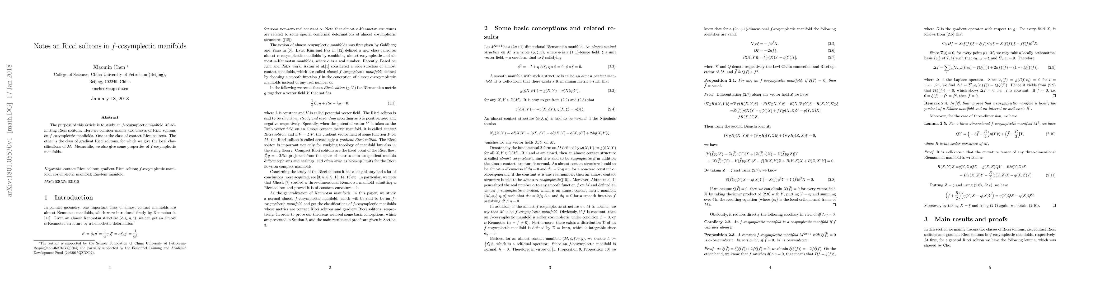 This paper explores Ricci solitons in $f$-cosymplectic manifolds, focusing on two types: contact Ricci solitons and gradient Ricci solitons, providing local classifications for the latter and discussing properties of $f$-cosymplectic manifolds.
