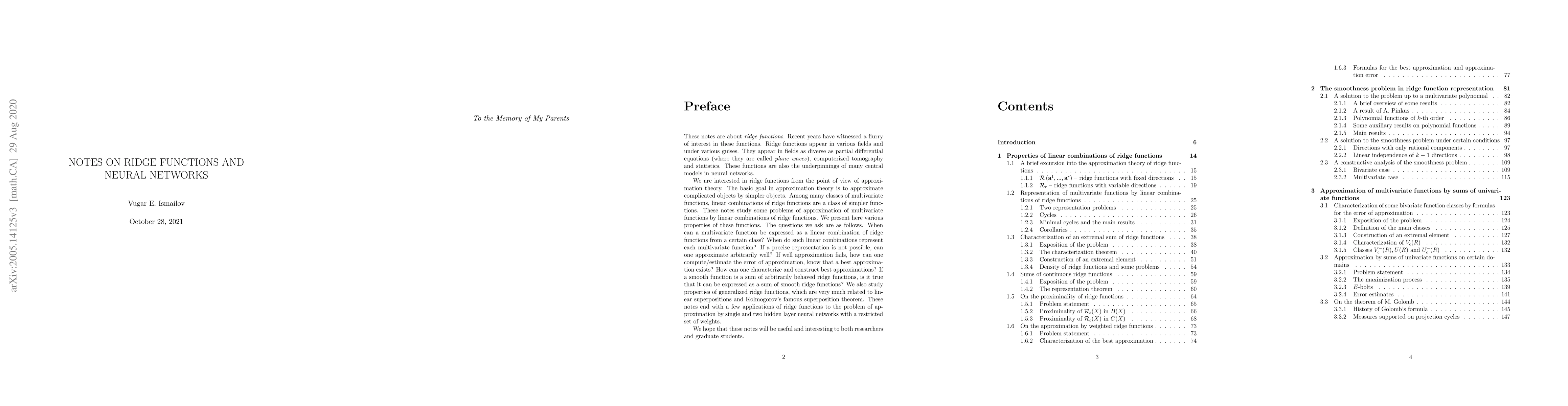 These notes are about ridge functions. Recent years have witnessed a flurry of interest in these functions. Ridge functions appear in various fields and under various guises. They appear in fields as diverse as partial differential equations (where they are called plane waves), computerized tomography and statistics. These functions are also the underpinnings of many central models in neural networks. We are interested in ridge functions from the point of view of approximation theory. The basic goal in approximation theory is to approximate complicated objects by simpler objects. Among many classes of multivariate functions, linear combinations of ridge functions are a class of simpler functions. These notes study some problems of approximation of multivariate functions by linear combinations of ridge functions. We present here various properties of these functions. The questions we ask are as follows. When can a multivariate function be expressed as a linear combination of ridge functions from a certain class? When do such linear combinations represent each multivariate function? If a precise representation is not possible, can one approximate arbitrarily well? If well approximation fails, how can one compute/estimate the error of approximation, know that a best approximation exists? How can one characterize and construct best approximations? If a smooth function is a sum of arbitrarily behaved ridge functions, can it be expressed as a sum of smooth ridge functions? We also study properties of generalized ridge functions, which are very much related to linear superpositions and Kolmogorov's famous superposition theorem. These notes end with a few applications of ridge functions to the problem of approximation by single and two hidden layer neural networks with a restricted set of weights. We hope that these notes will be useful and interesting to both researchers and students.