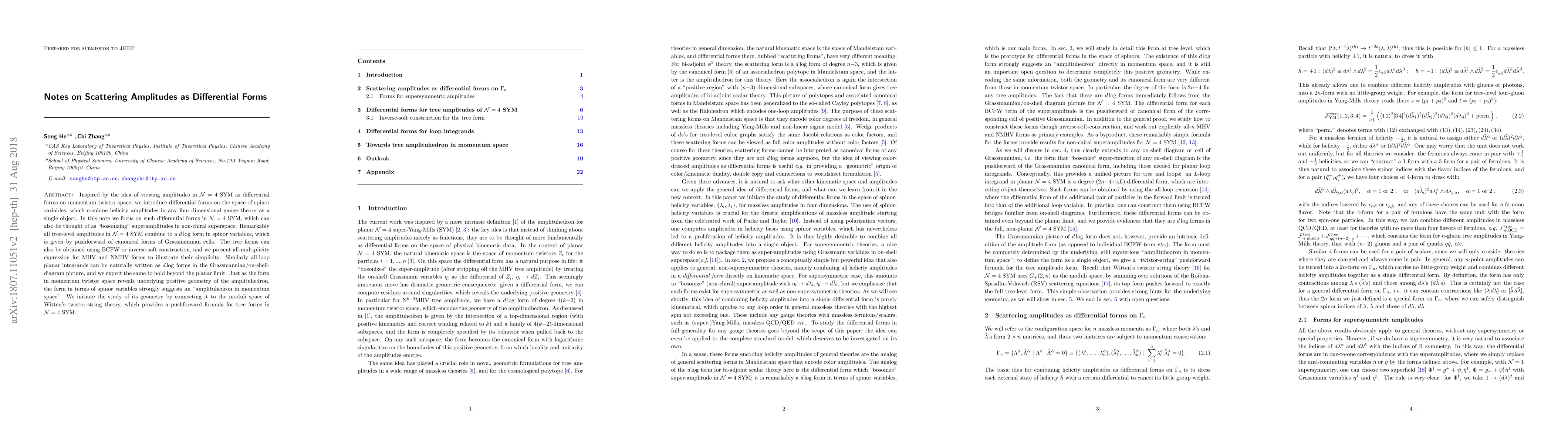 Inspired by the idea of viewing amplitudes in ${\cal N}=4$ SYM as differential forms on momentum twistor space, we introduce differential forms on the space of spinor variables, which combine helicity amplitudes in any four-dimensional gauge theory as a single object. In this note we focus on such differential forms in ${\cal N}=4$ SYM, which can also be thought of as "bosonizing" superamplitudes in non-chiral superspace. Remarkably all tree-level amplitudes in ${\cal N}=4$ SYM combine to a $d\log$ form in spinor variables, which is given by pushforward of canonical forms of Grassmannian cells, the tree forms can also be obtained using BCFW or inverse-soft construction, and we present all-multiplicity expression for MHV and NMHV forms to illustrate their simplicity. Similarly all-loop planar integrands can be naturally written as $d\log$ forms in the Grassmannian/on-shell-diagram picture, and we expect the same to hold beyond the planar limit. Just as the form in momentum twistor space reveals underlying positive geometry of the amplituhedron, the form in terms of spinor variables strongly suggests an "amplituhedron in momentum space". We initiate the study of its geometry by connecting it to the moduli space of Witten's twistor-string theory, which provides a pushforward formula for tree forms in ${\cal N}=4$ SYM.