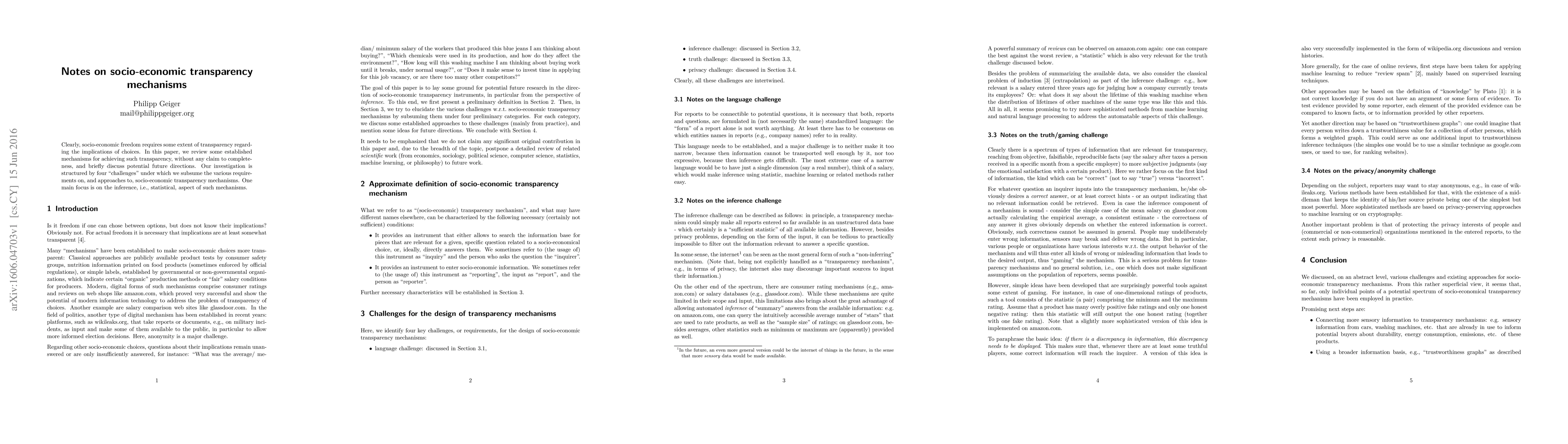 Clearly, socio-economic freedom requires some extent of transparency regarding the implications of choices. In this paper, we review some established mechanisms for achieving such transparency, without any claim to completeness, and briefly discuss potential future directions. Our investigation is structured by four "challenges" under which we subsume the various requirements on, and approaches to, socio-economic transparency mechanisms. One main focus is on the inference, i.e., statistical, aspect of such mechanisms.
