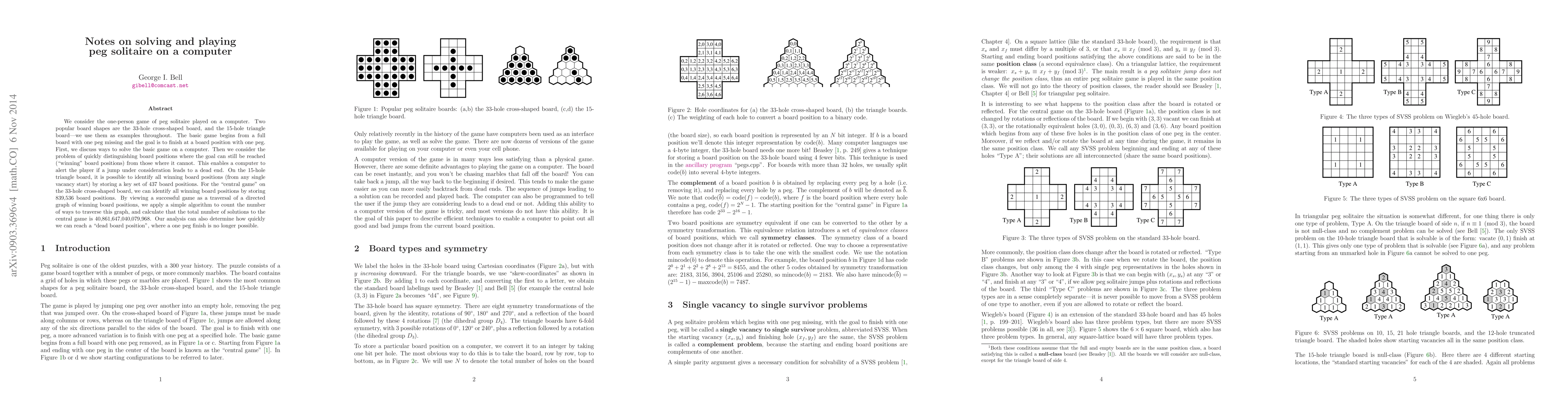 We consider the one-person game of peg solitaire played on a computer. Two popular board shapes are the 33-hole cross-shaped board, and the 15-hole triangle board---we use them as examples throughout. The basic game begins from a full board with one peg missing and the goal is to finish at a board position with one peg. First, we discuss ways to solve the basic game on a computer. Then we consider the problem of quickly distinguishing board positions where the goal can still be reached ("winning" board positions) from those where it cannot. This enables a computer to alert the player if a jump under consideration leads to a dead end. On the 15-hole triangle board, it is possible to identify all winning board positions (from any single vacancy start) by storing a key set of 437 board positions. For the "central game" on the 33-hole cross-shaped board, we can identify all winning board positions by storing 839,536 board positions. By viewing a successful game as a traversal of a directed graph of winning board positions, we apply a simple algorithm to count the number of ways to traverse this graph, and calculate that the total number of solutions to the central game is 40,861,647,040,079,968. Our analysis can also determine how quickly we can reach a "dead board position", where a one peg finish is no longer possible.