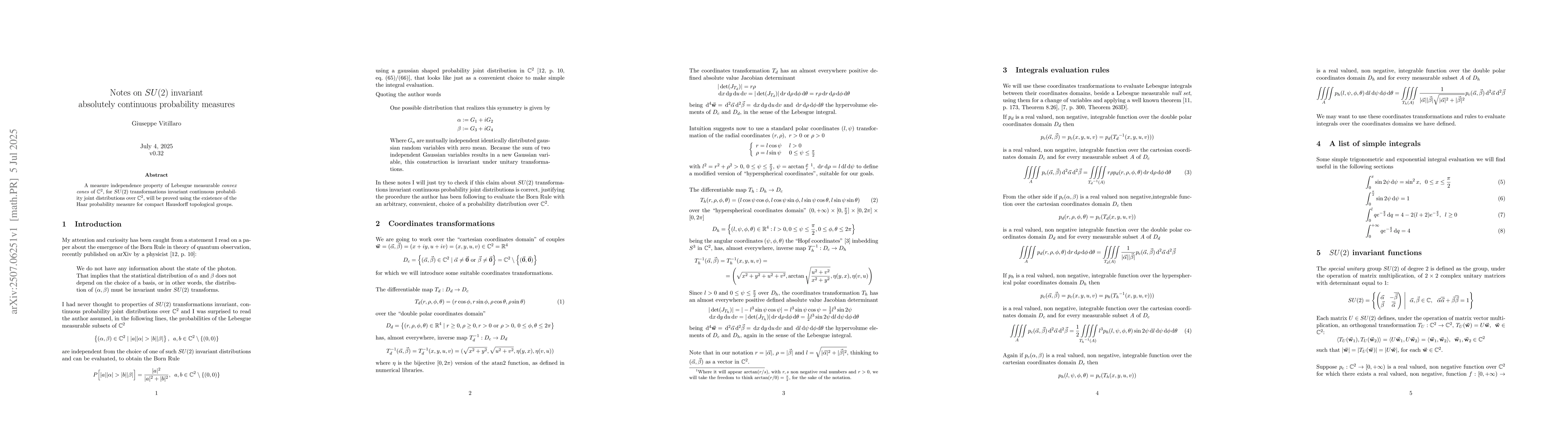 A measure independence property of Lebesgue measurable convex cones of $\mathbb{C}^2$, for $SU(2)$ transformations invariant continuous probability joint distributions over $\mathbb{C}^2$, will be proved using the existence of the Haar probability measure for compact Hausdorff topological groups.
