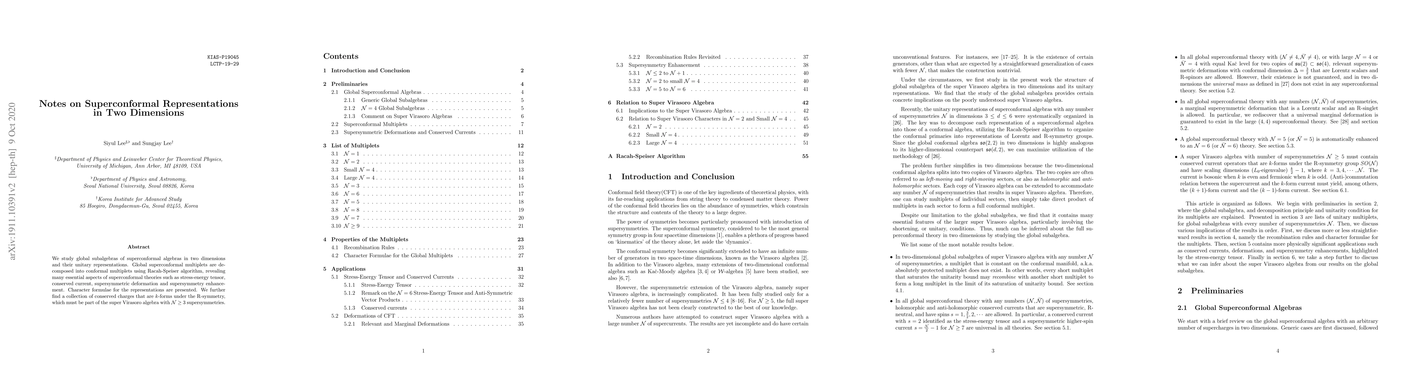 We study global subalgebras of superconformal algebras in two dimensions and their unitary representations. Global superconformal multiplets are decomposed into conformal multiplets using Racah-Speiser algorithm, revealing many essential aspects of superconformal theories such as stress-energy tensor, conserved current, supersymmetric deformation and supersymmetry enhancement. Character formulae for the representations are presented. We further find a collection of conserved charges that are $k$-forms under the R-symmetry, which must be part of the super Virasoro algebra with $\mathcal{N} \geq 3$ supersymmetries.