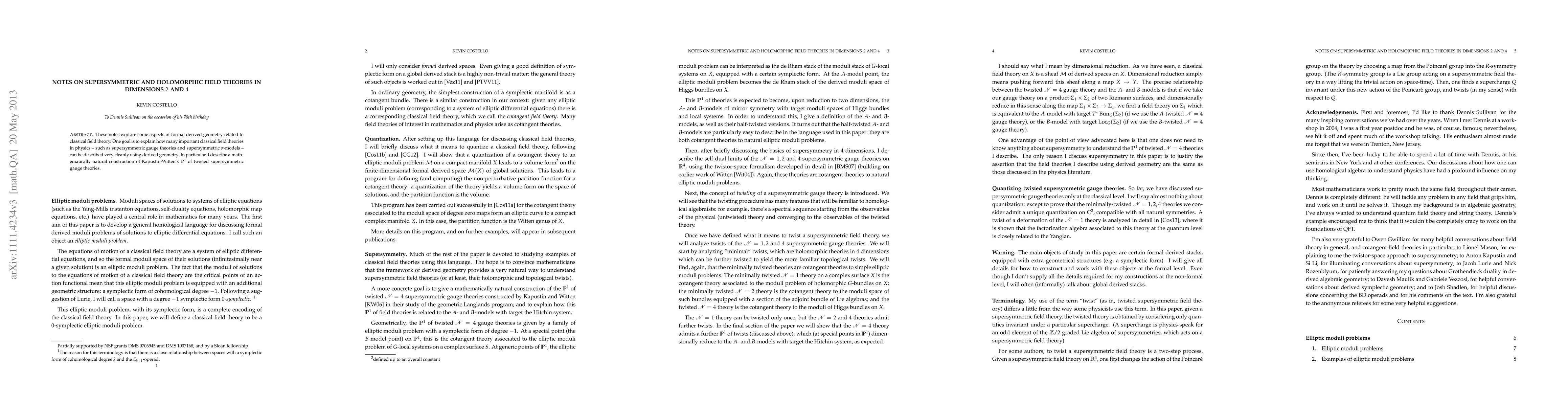 These notes discuss the application of derived geometry to describe classical field theories, focusing on supersymmetric gauge theories and sigma-models in dimensions 2 and 4, including a construction of Kapustin-Witten's P^1.