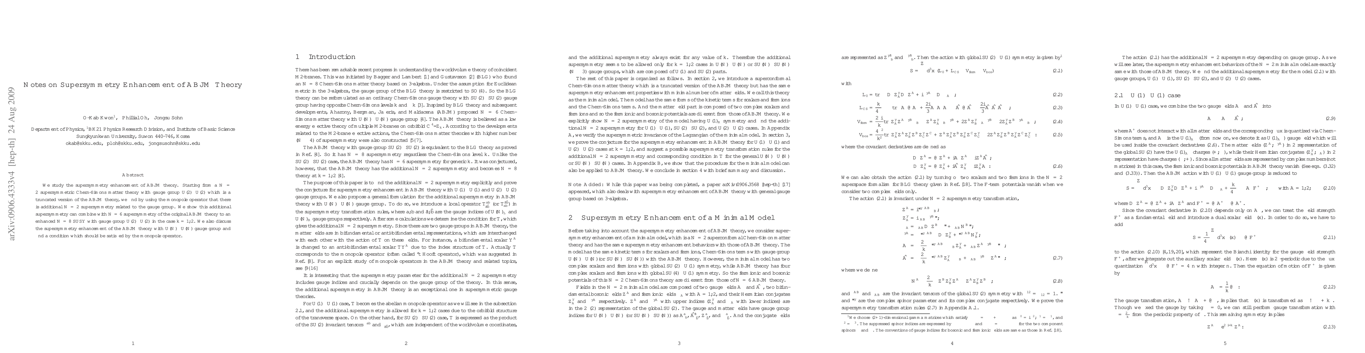 This paper investigates the enhancement of supersymmetry in the ABJM theory, revealing that an additional ${\cal N}=2$ supersymmetry can combine with the original ${\cal N}=6$ to achieve an enhanced ${\cal N}=8$ supersymmetry for $k=1,2$. It also explores the conditions for supersymmetry enhancement in the U($N$)$\times$U($N$) gauge group version.