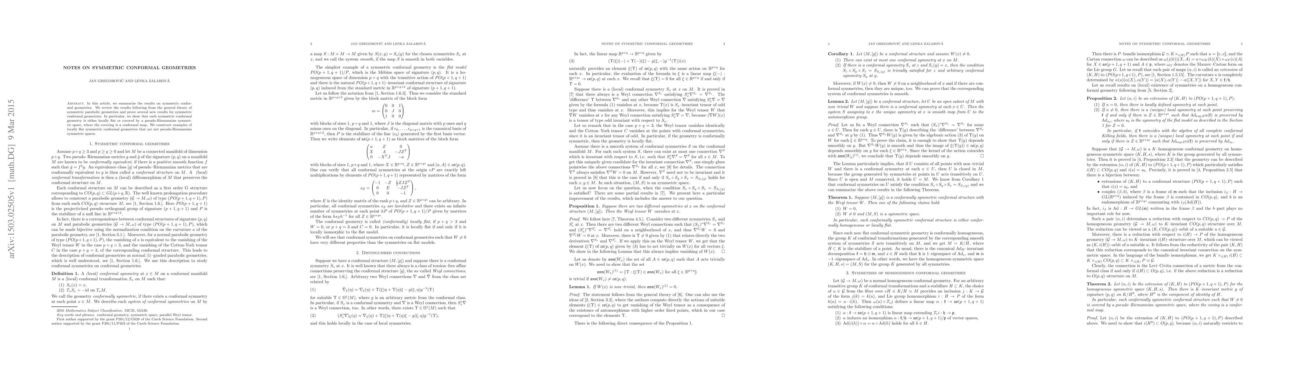 This paper reviews and extends the theory of symmetric conformal geometries, proving that any such geometry is either locally flat or conformally covered by a pseudo-Riemannian symmetric space, with examples of locally flat geometries that do not themselves qualify as pseudo-Riemannian symmetric spaces.