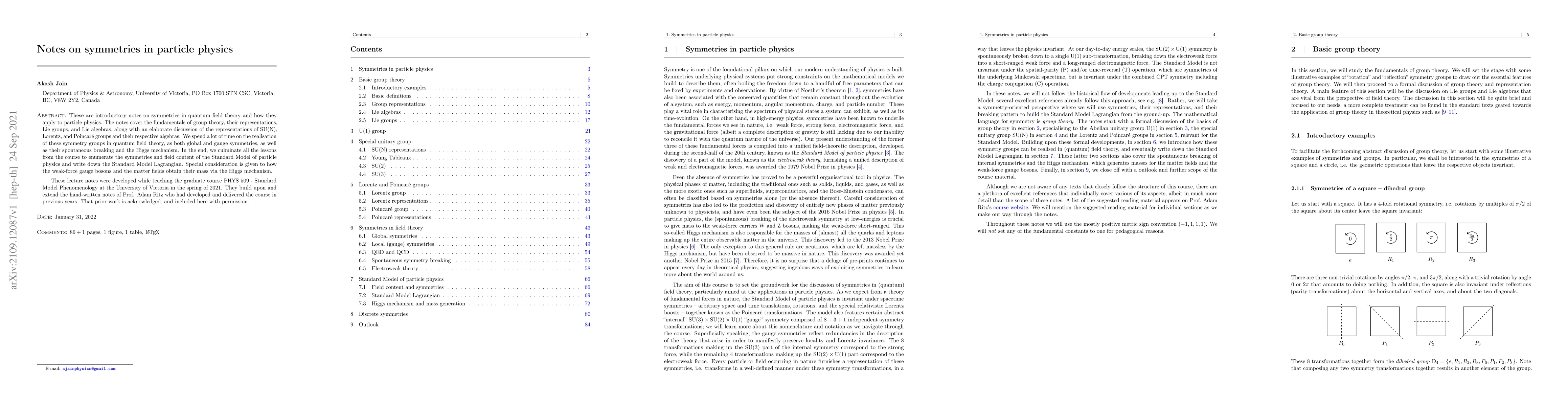 These notes introduce symmetries in quantum field theory, focusing on group theory, Lie groups, and their representations, particularly SU(N), Lorentz, and Poincaré groups. They also cover spontaneous symmetry breaking and the Higgs mechanism, culminating in the Standard Model Lagrangian and the mass generation of weak-force gauge bosons and matter fields.