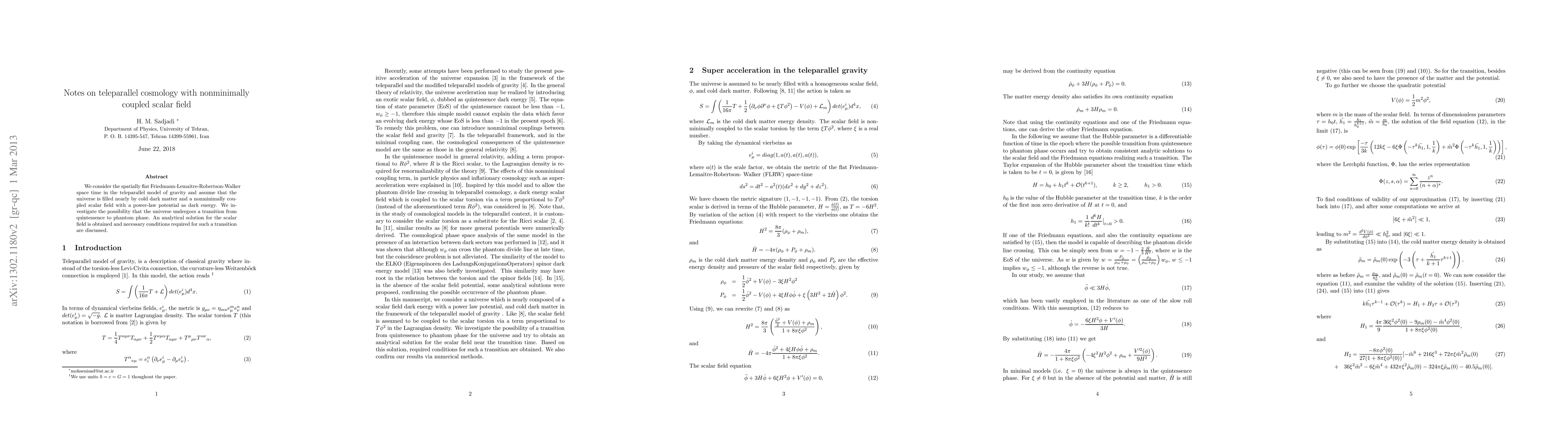 This paper explores teleparallel cosmology with a nonminimally coupled scalar field, examining a transition from quintessence to phantom phase in a spatially flat universe dominated by cold dark matter and dark energy with a power-law potential. Analytical solutions for the scalar field are derived, and conditions for the quintessence-phantom transition are identified.