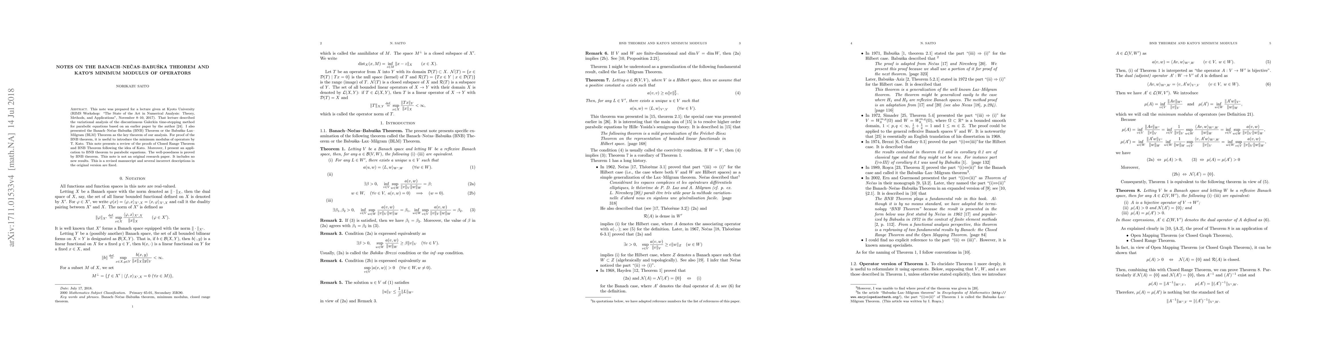 This note was prepared for a lecture given at Kyoto University (RIMS Workshop: "The State of the Art in Numerical Analysis: Theory, Methods, and Applications", November 8-10, 2017). That lecture described the variational analysis of the discontinuous Galerkin time-stepping method for parabolic equations based on an earlier paper by the author (arXiv:1710.10543). I also presented the Banach-Necas-Babuska (BNB) Theorem or the Babuska-Lax-Milgram (BLM) Theorem as the key theorem of our analysis. For proof of the BNB theorem, it is useful to introduce the minimum modulus of operators by T. Kato. This note presents a review of the proofs of Closed Range Theorem and BNB Theorem following the idea of Kato. Moreover, I present an application to BNB theorem to parabolic equations. The well-posedness is proved by BNB theorem. This note is not an original research paper. It includes no new results. This is a revised manuscript and several incorrect descriptions in the original version are fixed.