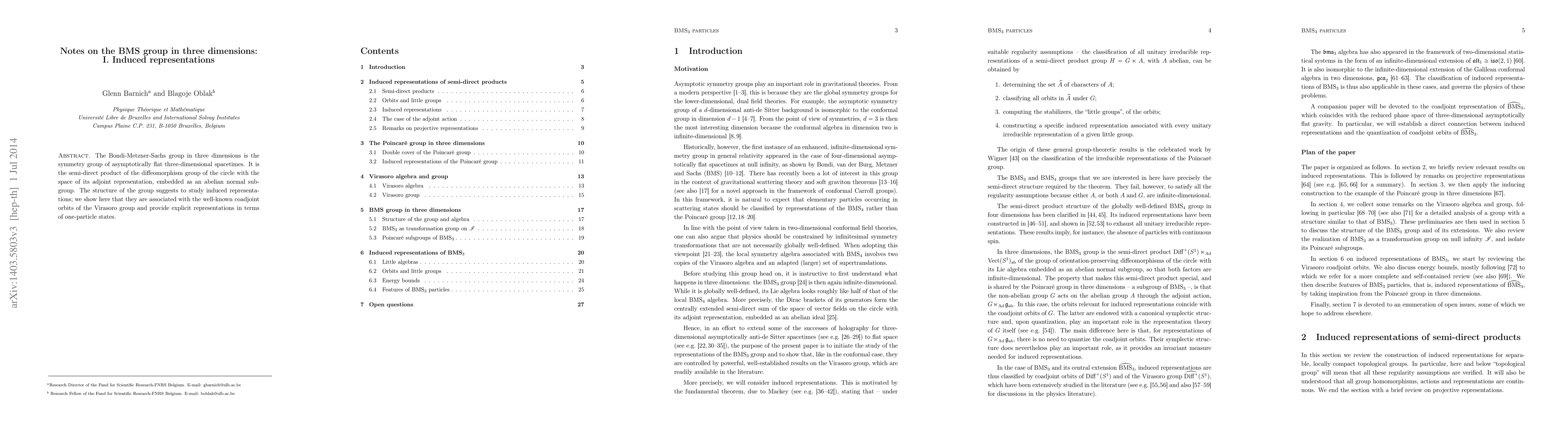 This paper explores the induced representations of the three-dimensional Bondi-Metzner-Sachs (BMS) group, revealing their connection to the coadjoint orbits of the Virasoro group and offering explicit representations through one-particle states. The study highlights the BMS group's structure as a semi-direct product involving the diffeomorphism group of the circle.