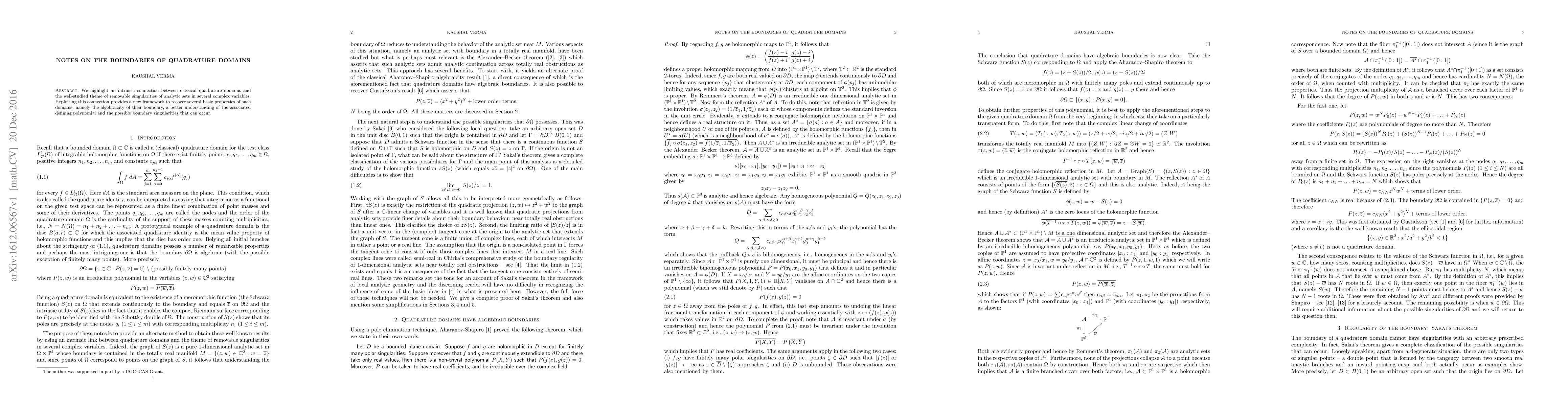 We highlight an intrinsic connection between classical quadrature domains and the well-studied theme of removable singularities of analytic sets in several complex variables. Exploiting this connection provides a new framework to recover several basic properties of such domains, namely the algebraicity of their boundary, a better understanding of the associated defining polynomial and the possible boundary singularities that can occur.