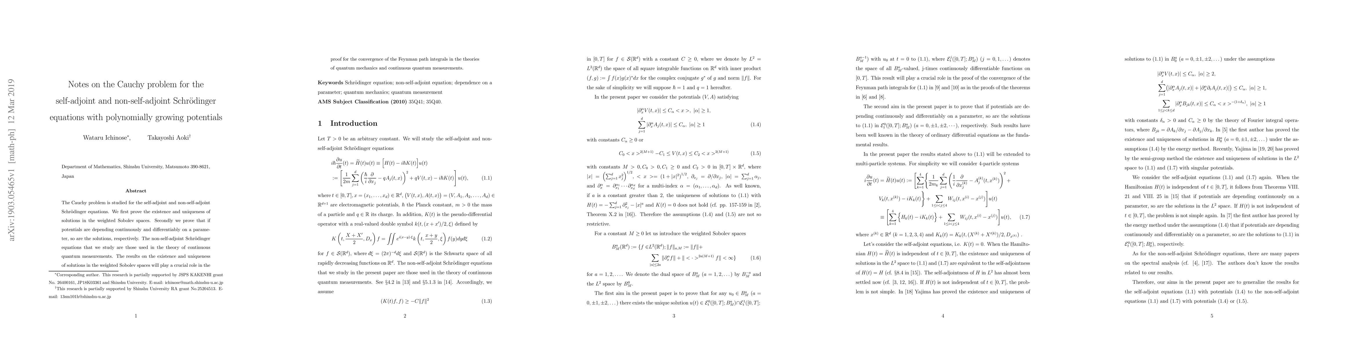 The Cauchy problem is studied for the self-adjoint and non-self-adjoint Schroedinger equations. We first prove the existence and uniqueness of solutions in the weighted Sobolev spaces. Secondly we prove that if potentials are depending continuously and differentiably on a parameter, so are the solutions, respectively. The non-self-adjoint Schroedinger equations that we study are those used in the theory of continuous quantum measurements. The results on the existence and uniqueness of solutions in the weighted Sobolev spaces will play a crucial role in the proof for the convergence of the Feynman path integrals in the theories of quantum mechanics and continuous quantum measurements.