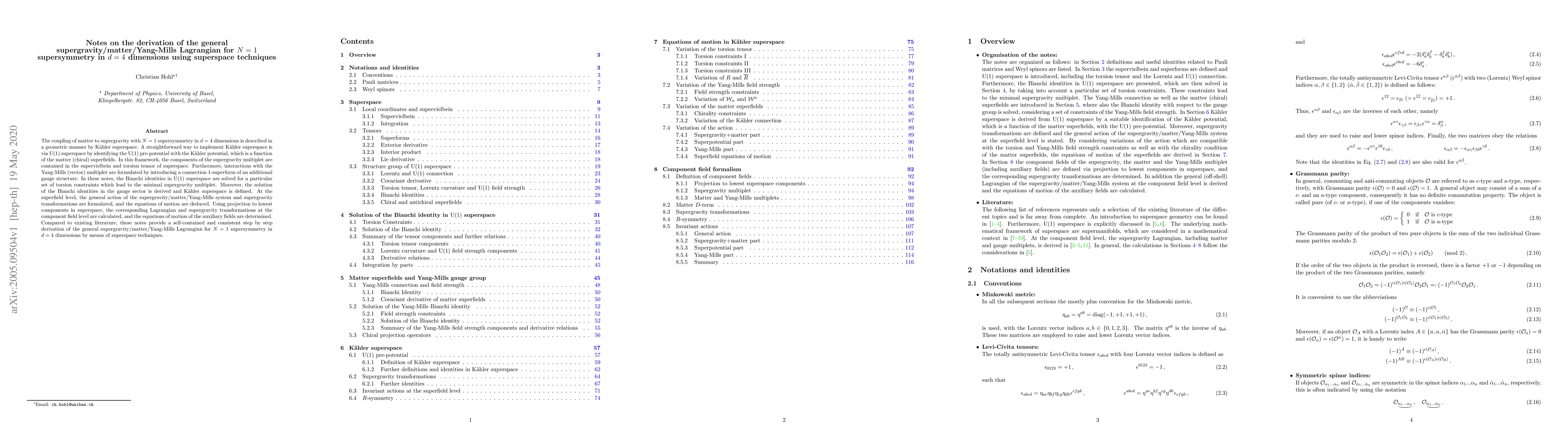 This paper derives the general $N=1$ supergravity/matter/Yang-Mills Lagrangian in $d=4$ dimensions using superspace techniques, focusing on the implementation of Kähler superspace via $\mathrm{U}(1)$ superspace. The resulting Lagrangian and equations of motion are derived step by step, providing a self-contained derivation compared to existing literature.
