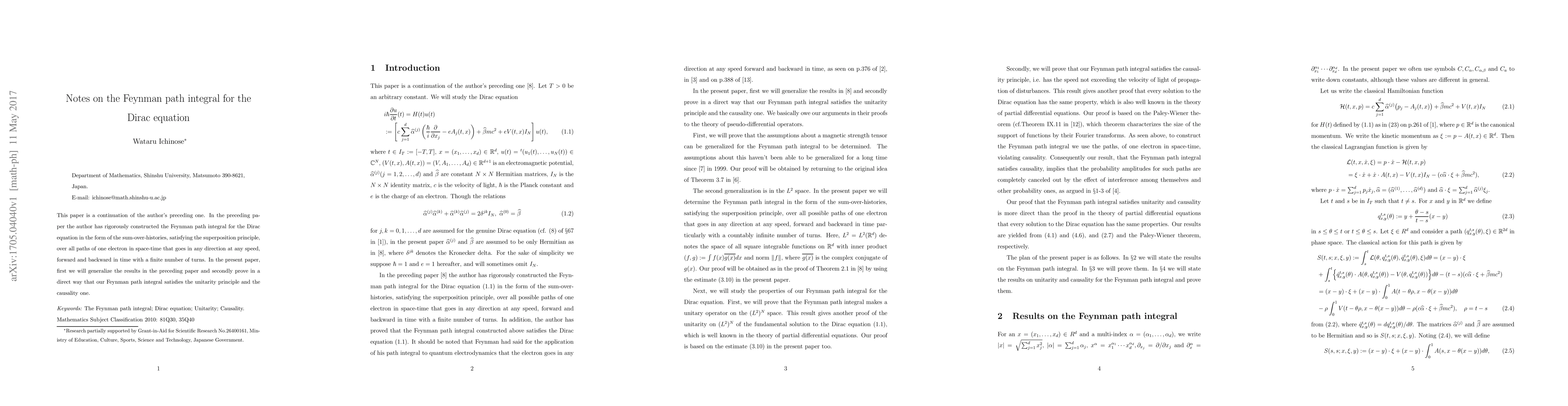 This paper extends the rigorous construction of the Feynman path integral for the Dirac equation, confirming its adherence to the superposition principle. It further proves the unitarity and causality principles for the proposed path integral formulation.