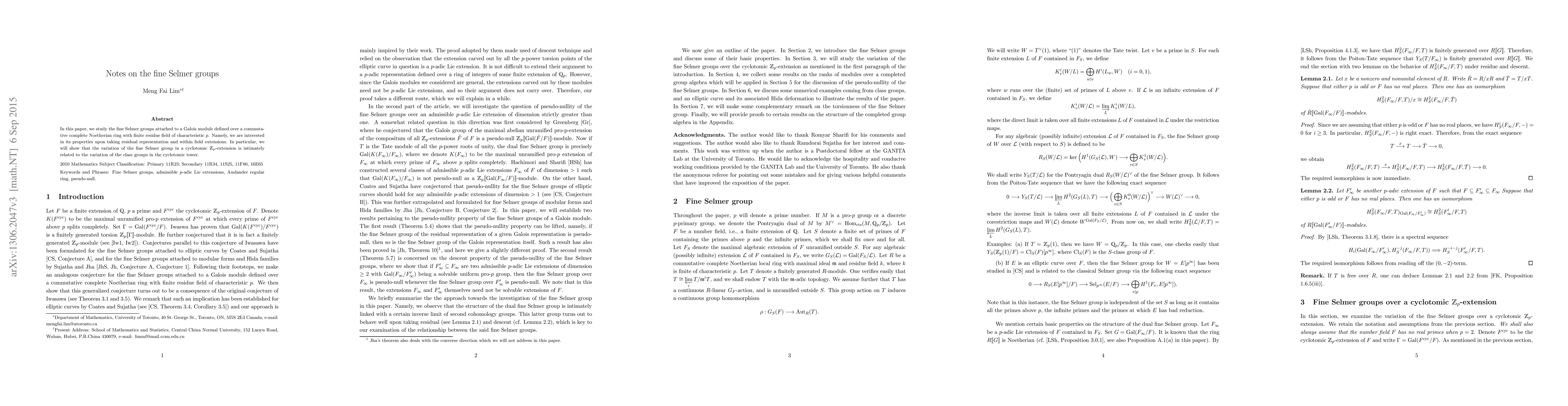 This paper investigates fine Selmer groups linked to Galois modules over complete Noetherian rings with finite characteristic p residue fields. It reveals the connection between the variation of fine Selmer groups in cyclotomic $\mathbb{Z}_p$-extensions and class group variations in the cyclotomic tower, alongside examples illustrating pseudo-nullity of fine Selmer groups.