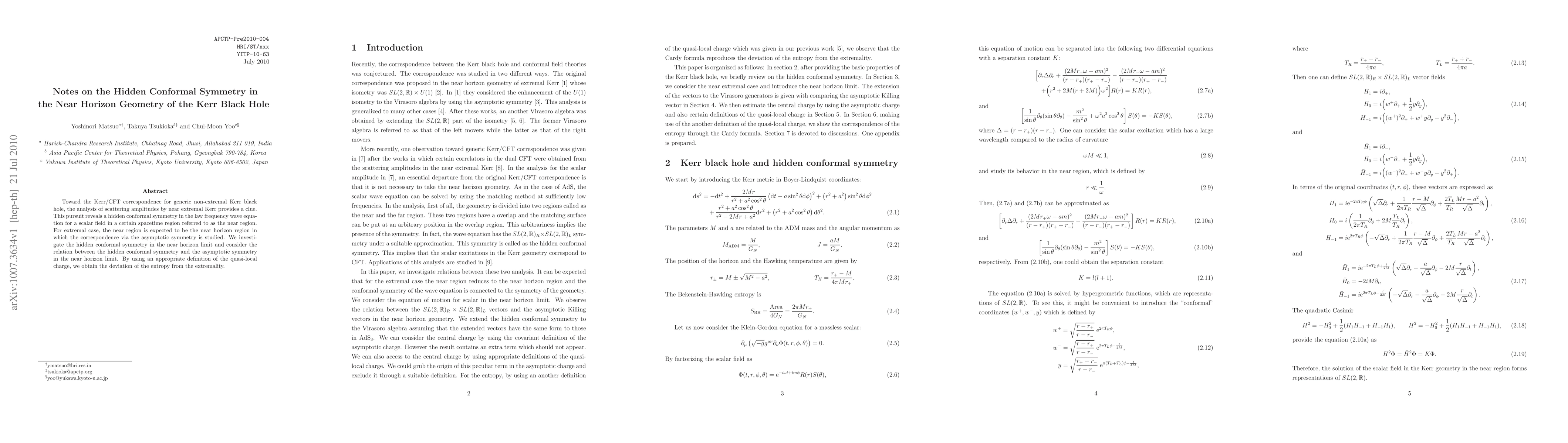 Summary: The paper explores the hidden conformal symmetry in the near horizon geometry of the Kerr black hole, revealing a correspondence that hints at an underlying connection to scattering amplitudes and quasi-local charges, ultimately contributing to the understanding of entropy deviations from extremality.