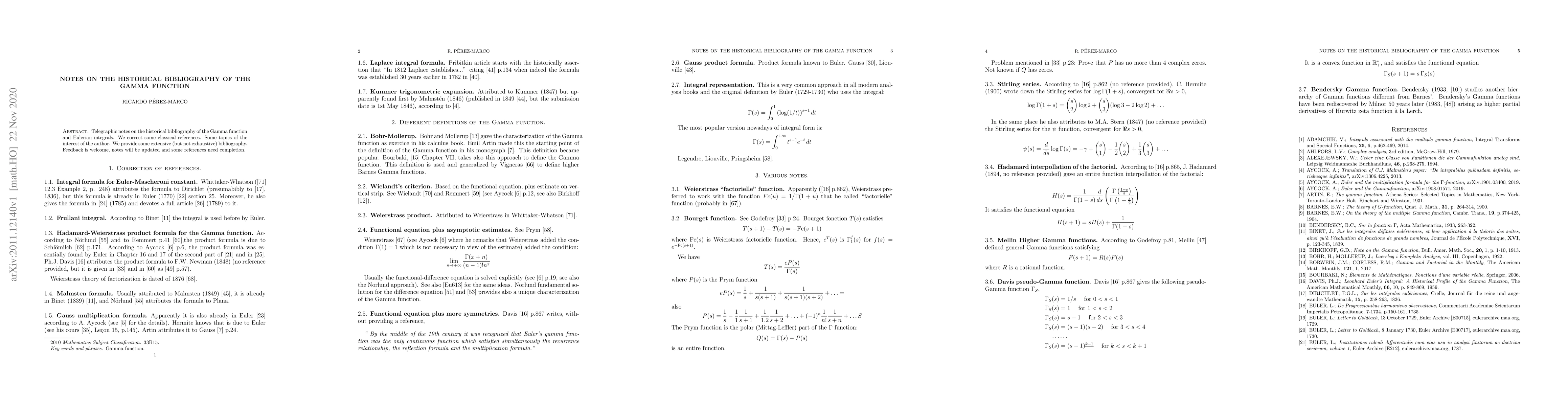 Telegraphic notes on the historical bibliography of the Gamma function and Eulerian integrals. Correction to some classical references. Some topics of the interest of the author. We provide some extensive (but not exhaustive) bibliography. Feedback is welcome, notes will be updated and some references need completion.