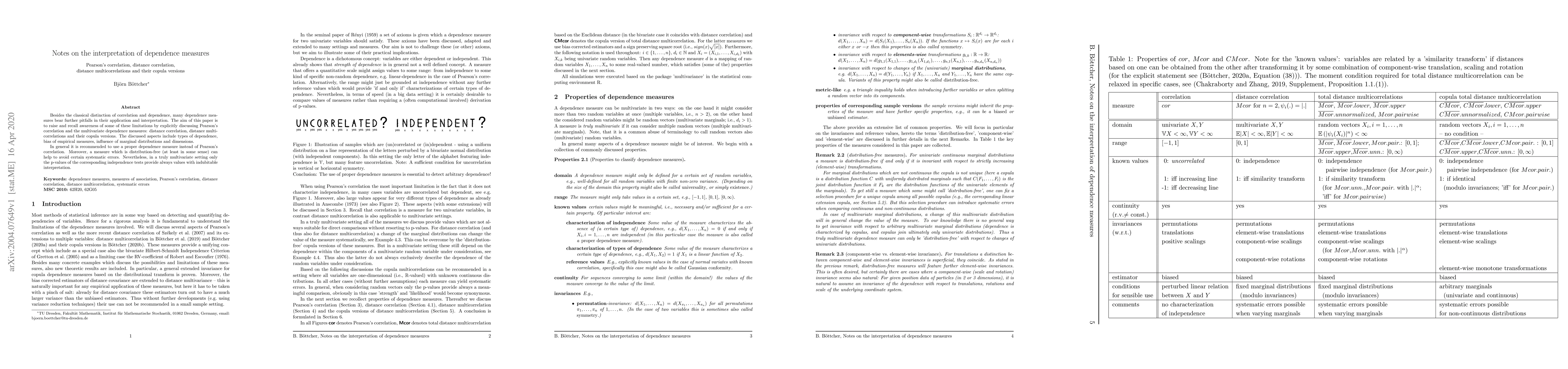This paper discusses various dependence measures beyond Pearson's correlation, highlighting their limitations and biases, and emphasizes the importance of using distribution-free measures to avoid systematic errors, while noting that p-values from independence tests remain the most reliable in multivariate settings.