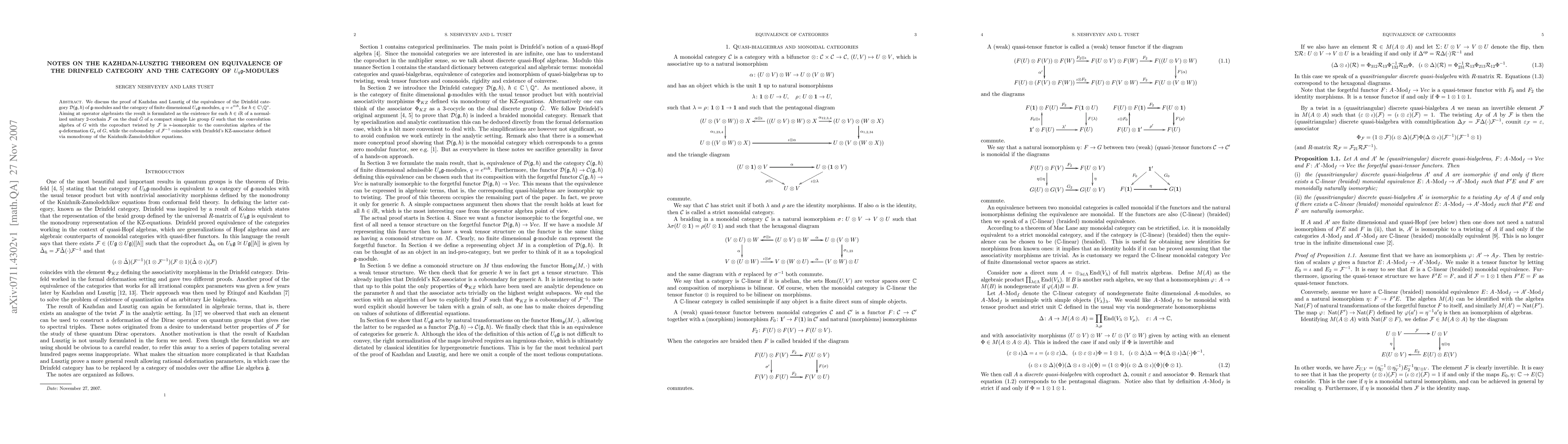 We discuss the proof of Kazhdan and Lusztig of the equivalence of the Drinfeld category D(g,h) of g-modules and the category of finite dimensional Uq(g)-modules, q=exp(\pi ih), for h\in C\Q*. Aiming at operator algebraists the result is formulated as the existence for each h\in iR of a normalized unitary 2-cochain F on the dual \hat G of a compact simple Lie group G such that the convolution algebra of G with the coproduct twisted by F is *-isomorphic to the convolution algebra of the q-deformation G_q of G, while the coboundary of F^{-1} coincides with Drinfeld's KZ-associator defined via monodromy of the Knizhnik-Zamolodchikov equations.