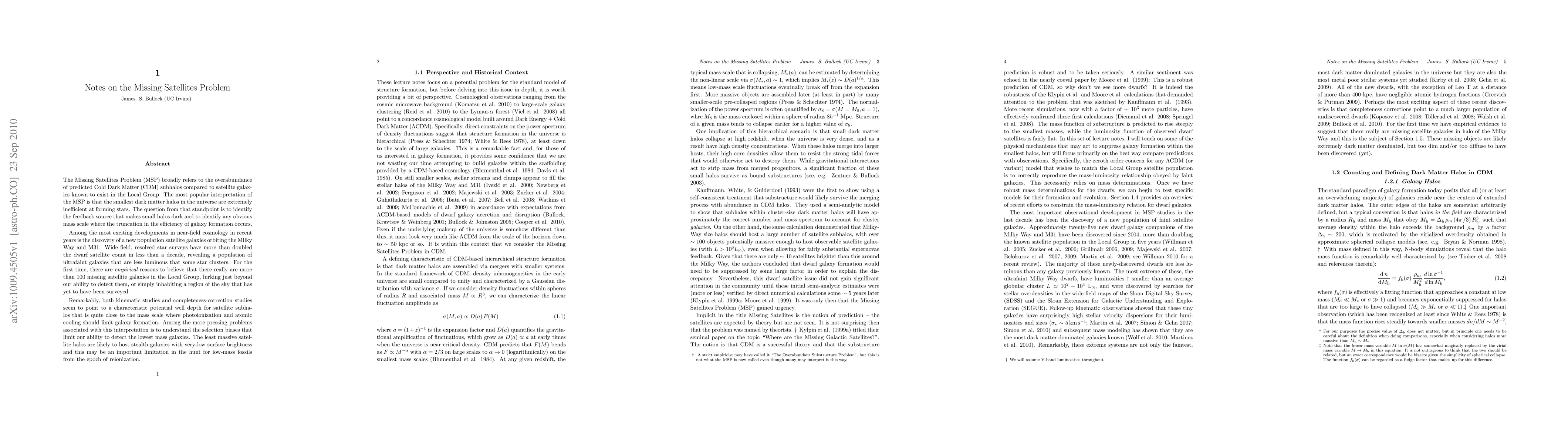 The Missing Satellites Problem (MSP) broadly refers to the overabundance of predicted Cold Dark Matter (CDM) subhalos compared to satellite galaxies known to exist in the Local Group. The most popular interpretation of the MSP is that the smallest dark matter halos in the universe are extremely inefficient at forming stars. The question from that standpoint is to identify the feedback source that makes small halos dark and to identify any obvious mass scale where the truncation in the efficiency of galaxy formation occurs. Among the most exciting developments in near-field cosmology in recent years is the discovery of a new population satellite galaxies orbiting the Milky Way and M31. Wide field, resolved star surveys have more than doubled the dwarf satellite count in less than a decade, revealing a population of ultrafaint galaxies that are less luminous that some star clusters. For the first time, there are empirical reasons to believe that there really are missing satellite galaxies in the Local Group, lurking just beyond our ability to detect them, or simply inhabiting a region of the sky that has yet to have been surveyed. Both kinematic studies and completeness-correction studies seem to point to a characteristic potential well depth for satellite subhalos that is quite close to the mass scale where photoionization and atomic cooling should limit galaxy formation. Among the more pressing problems associated with this interpretation is to understand the selection biases that limit our ability to detect the lowest mass galaxies. The least massive satellite halos are likely to host stealth galaxies with very-low surface brightness and this may be an important limitation in the hunt for low-mass fossils from the epoch of reionization.