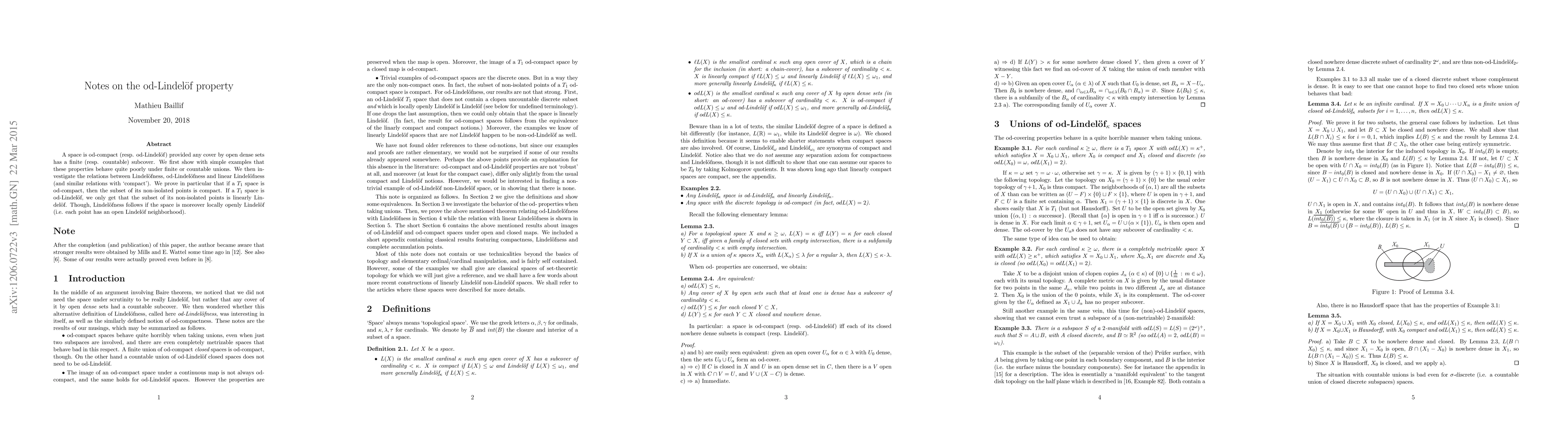 This paper explores the od-Lindel\"of property in topological spaces, where a space is od-Lindel\"of if any cover by open dense sets has a countable subcover. The study reveals that od-Lindel\"ofness does not always behave well under unions and investigates its relationship with other properties like Lindel\"ofness and linear Lindel\"ofness. It concludes that if a $T_1$ space is od-compact, its non-isolated points form a compact subset, while for od-Lindel\"of spaces, the non-isolated points are only linearly Lindel\"of unless the space is locally openly Lindel\"of.