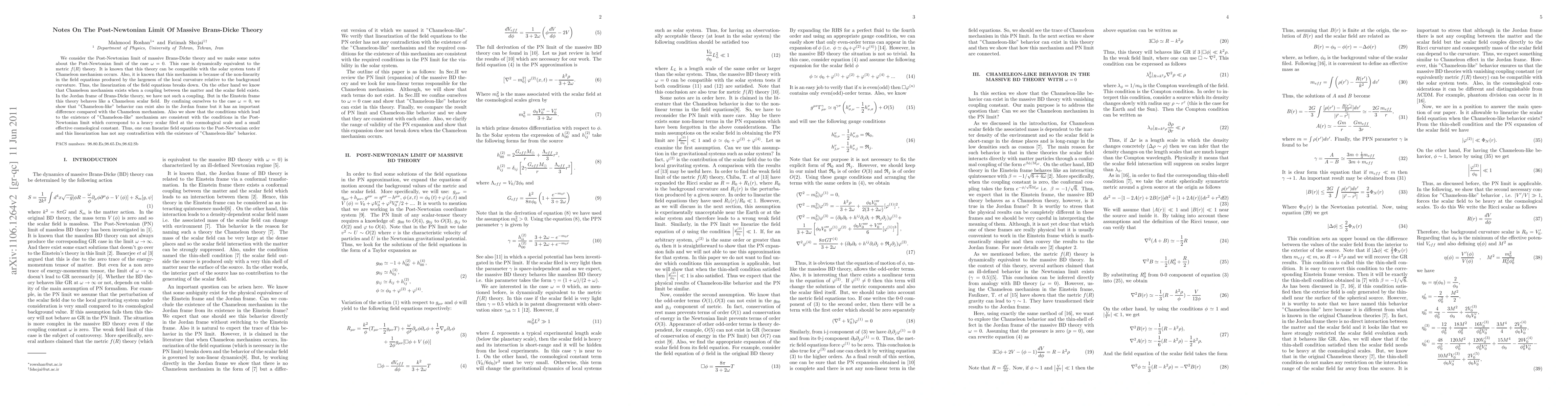 We consider the Post-Newtonian limit of massive Brans-Dicke theory and we make some notes about the Post-Newtonian limit of the case $\omega=0$. This case is dynamically equivalent to the metric $f(R)$ theory. It is known that this theory can be compatible with the solar system tests if Chameleon mechanism occurs. Also, it is known that this mechanism is because of the non-linearity in the field equations produced by the largeness of the local curvature relative to the background curvature. Thus, the linearization of the field equations breaks down. On the other hand we know that Chameleon mechanism exists when a coupling between the matter and the scalar field exists. In the Jordan frame of Brans-Dicke theory, we have not such a coupling. But in the Einstein frame this theory behaves like a Chameleon scalar field. By confining ourselves to the case $\omega=0$, we show that "Chameleon-like" behavior can exist also in the Jordan frame but it has an important difference compared with the Chameleon mechanism. Also we show that the conditions which lead to the existence of "Chameleon-like" mechanism are consistent with the conditions in the Post-Newtonian limit which correspond to a heavy scalar filed at the cosmological scale and a small effective cosmological constant. Thus, one can linearize field equations to the Post-Newtonian order and this linearization has not any contradiction with the existence of "Chameleon-like" behavior.