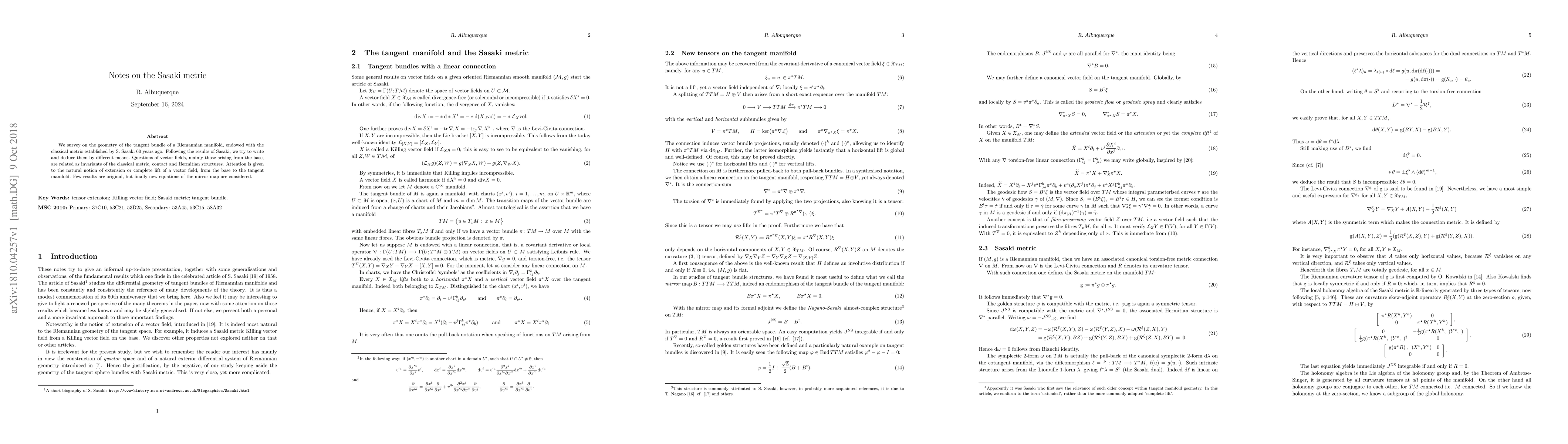 We survey on the geometry of the tangent bundle of a Riemannian manifold, endowed with the classical metric established by S. Sasaki 60 years ago. Following the results of Sasaki, we try to write and deduce them by different means. Questions of vector fields, mainly those arising from the base, are related as invariants of the classical metric, contact and Hermitian structures. Attention is given to the natural notion of extension or complete lift of a vector field, from the base to the tangent manifold. Few results are original, but finally new equations of the mirror map are considered.