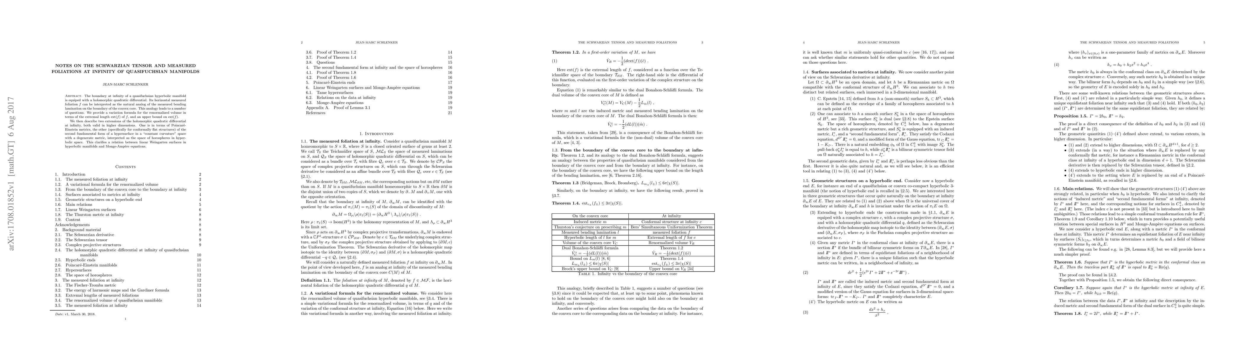 The boundary at infinity of a quasifuchsian hyperbolic manifold is equiped with a holomorphic quadratic differential. Its horizontal measured foliation $f$ can be interpreted as the natural analog of the measured bending lamination on the boundary of the convex core. This analogy leads to a number of questions. We provide a variation formula for the renormalized volume in terms of the extremal length $\ext(f)$ of $f$, and an upper bound on $\ext(f)$. We then describe two extensions of the holomorphic quadratic differential at infinity, both valid in higher dimensions. One is in terms of Poincar\'e-Einstein metrics, the other (specifically for conformally flat structures) of the second fundamental form of a hypersurface in a "constant curvature" space with a degenerate metric, interpreted as the space of horospheres in hyperbolic space. This clarifies a relation between linear Weingarten surfaces in hyperbolic manifolds and Monge-Amp\`ere equations.
